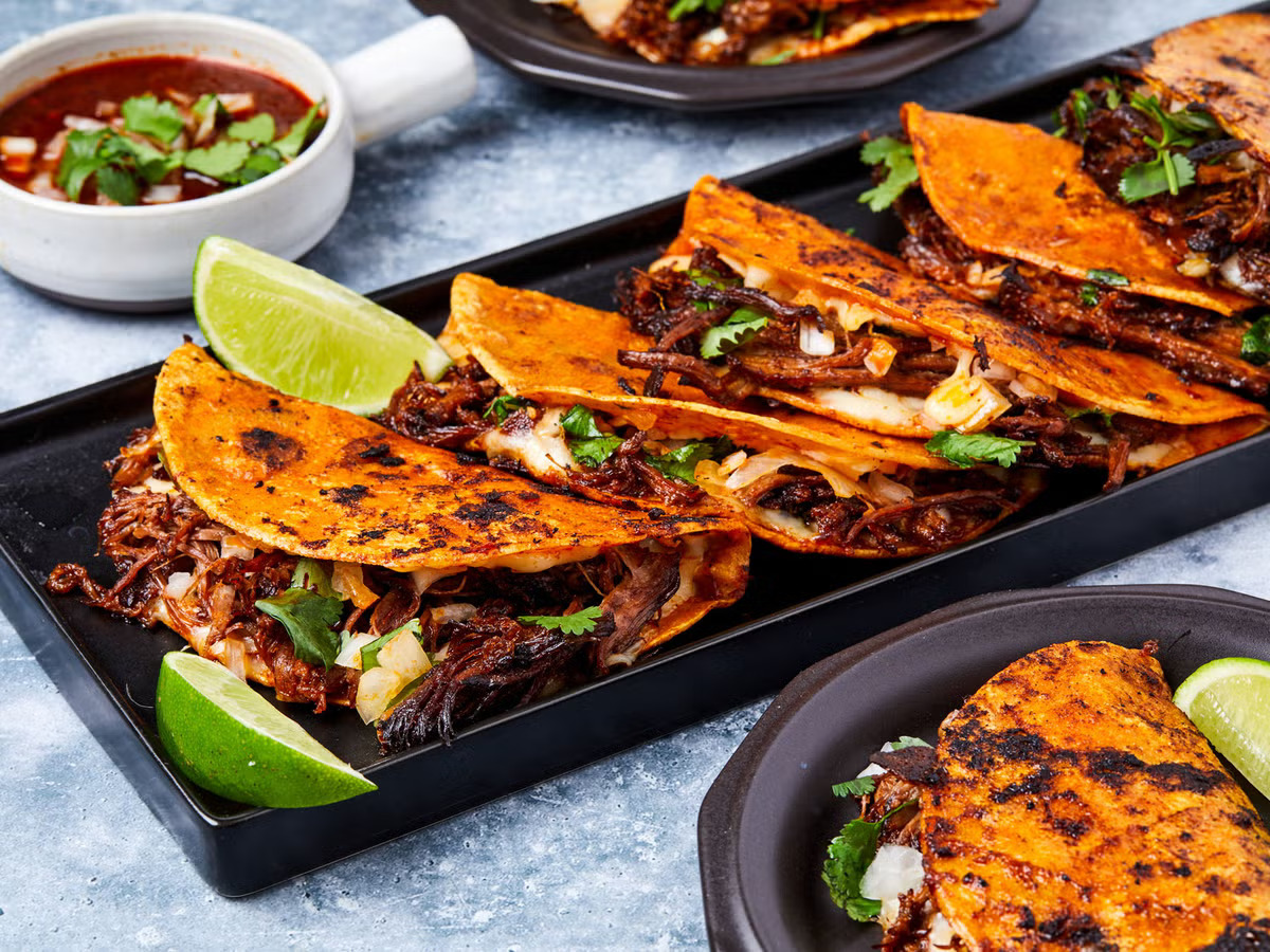 Birria usulü pişirilmiş et ve erimiş peynirle doldurulan tortillaların tavada çıtırlaştırılmasıyla hazırlanan quesabirria, yanında consomé ile servis edilen modern Meksika sokak mutfağının yıldızlarından biridir.