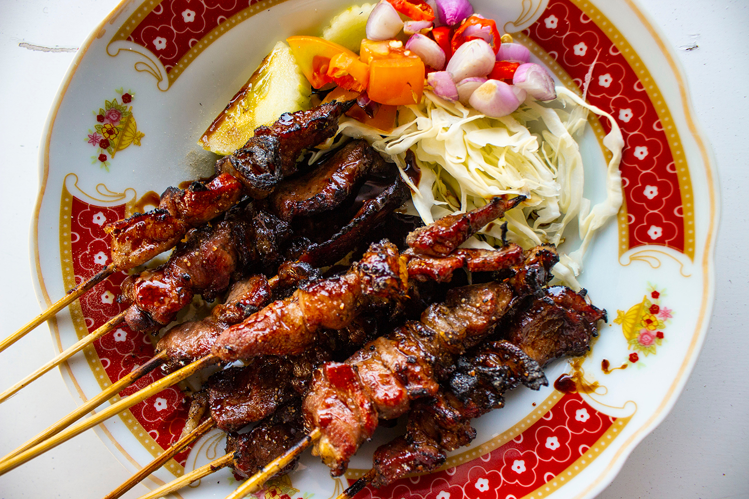 4.SATE KAMBING (Endonezya): Keçi ya da koyun etinin tatlı soya sosu, baharatlar ve ananas suyuyla marine edilip bambu şişlerde ızgarada pişirilmesiyle hazırlanan sate kambing, özellikle Java’da yaygın olarak tüketilen aromatik ve doyurucu bir satay çeşididir.