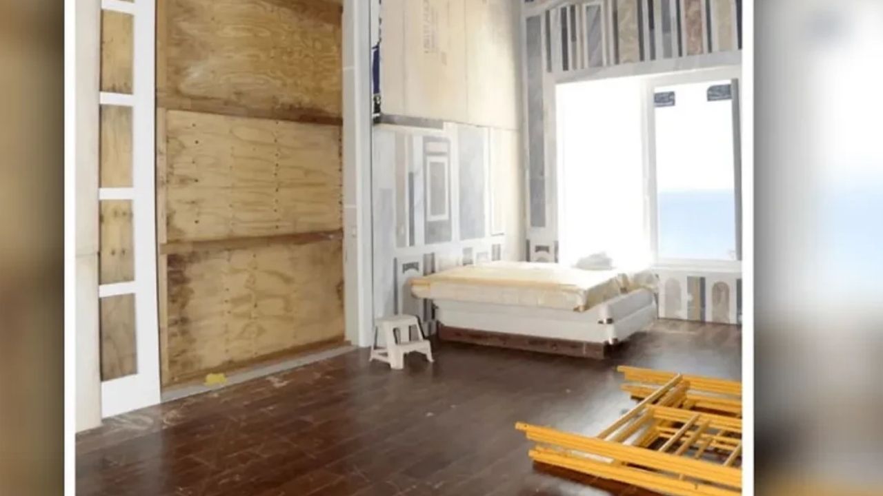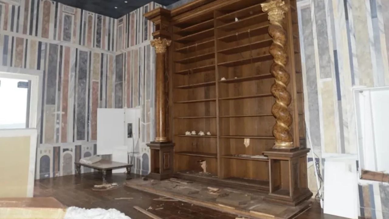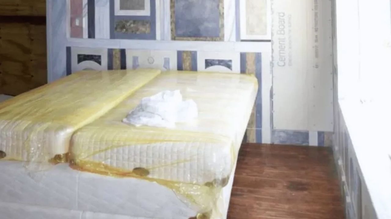 Bir duvar boyunca yerden tavana uzanan büyük ahşap bir kitaplık olsa da rafların tamamen boş olduğu görülüyor. Büyük, çift kanatlı bir pencerenin yakınındaki köşede ise sararmış naylonla kaplı, kirli görünen iki adet tek kişilik beyaz yatak bulunuyor.