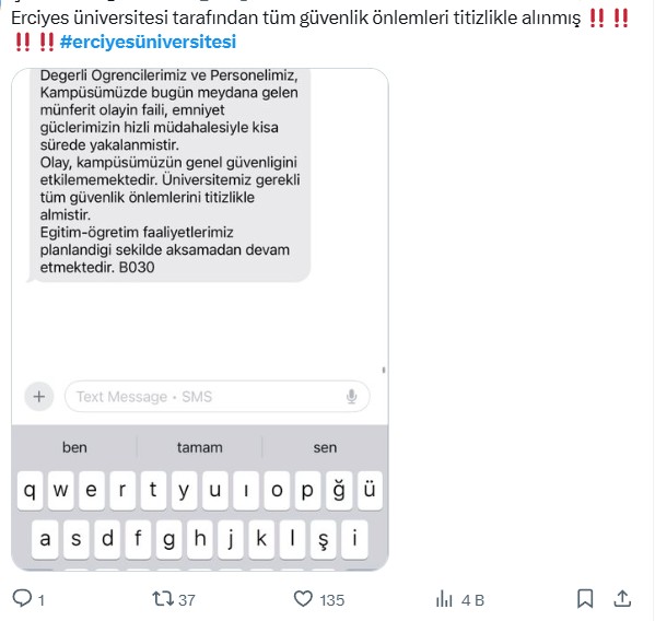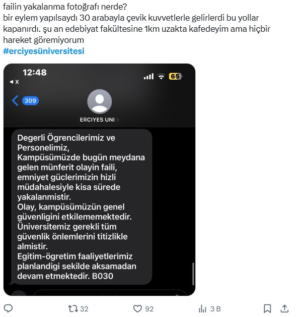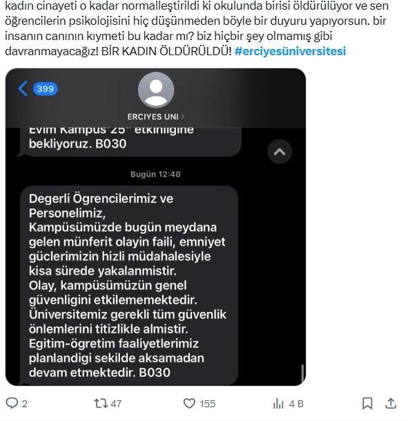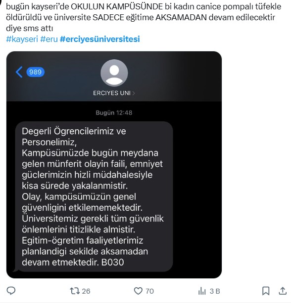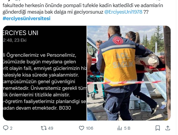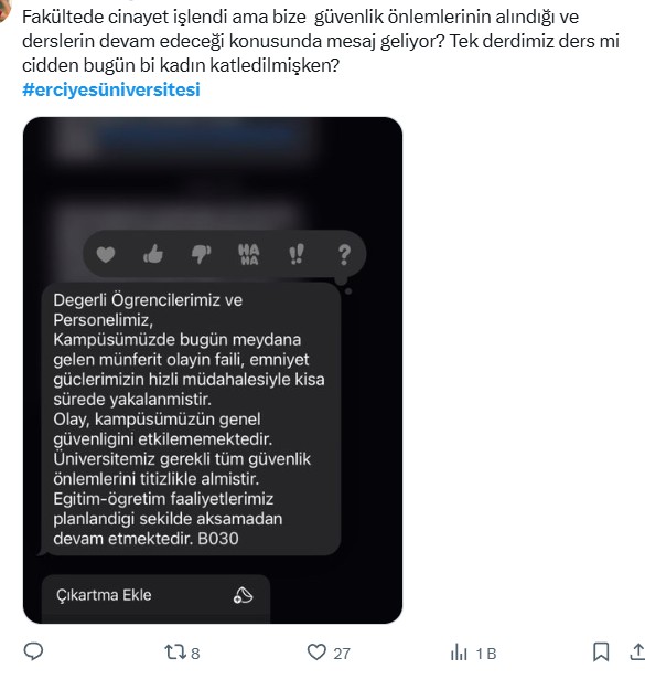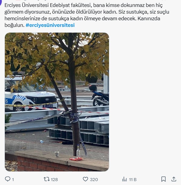 Kayseri'de bir kadın eski eşi tarafından Erciyes Üniversitesi Edebiyat Fakültesi girişinde saldırıya uğradı.