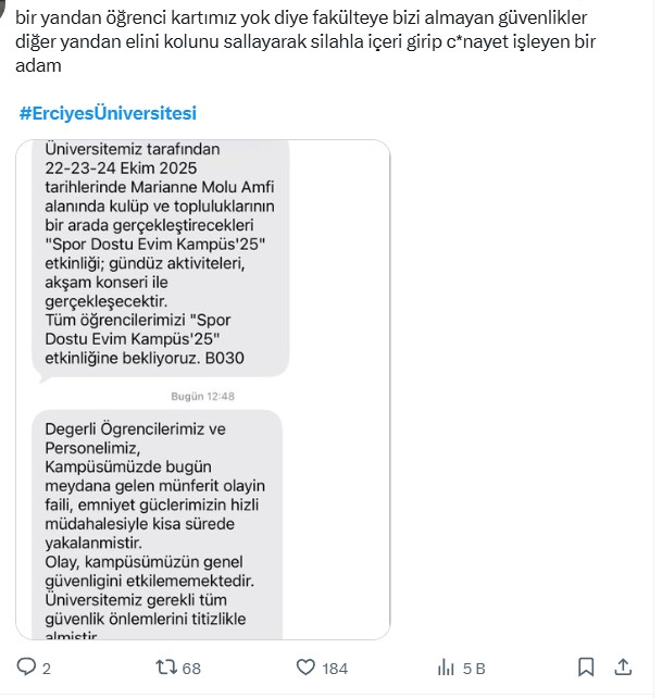 Türk Halk Bilimi öğrencisi Meliha K., fakülte binasının öğrenci girişinde eski eşi F.K. tarafından pompalı tüfekle vuruldu.