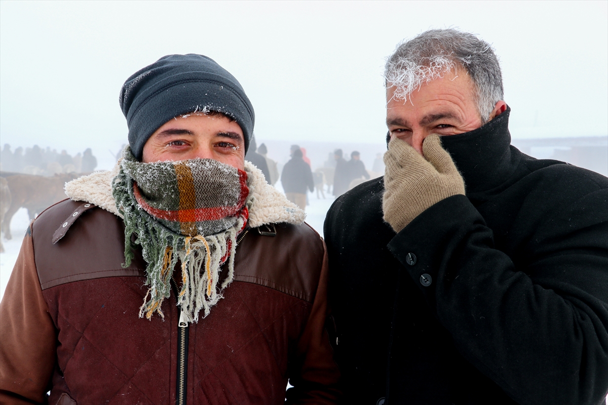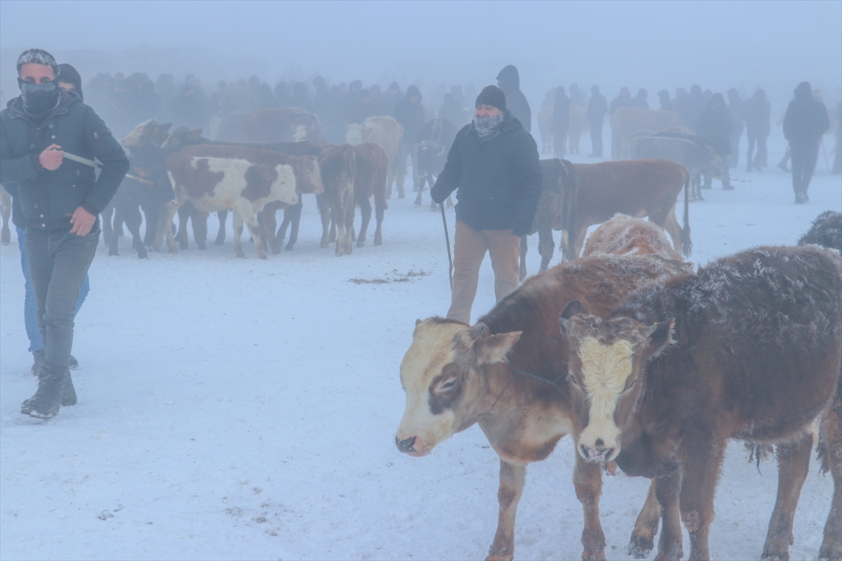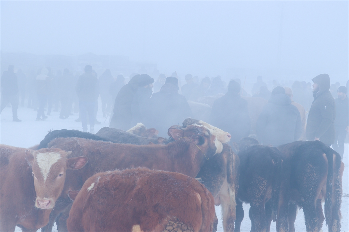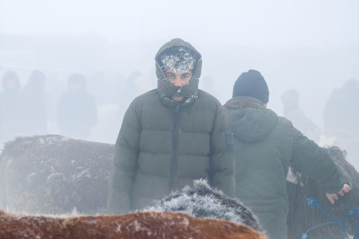 Erken saatlerde hayvan borsasına giden vatandaşların kaş ve saçlarında kırağı oluştu.