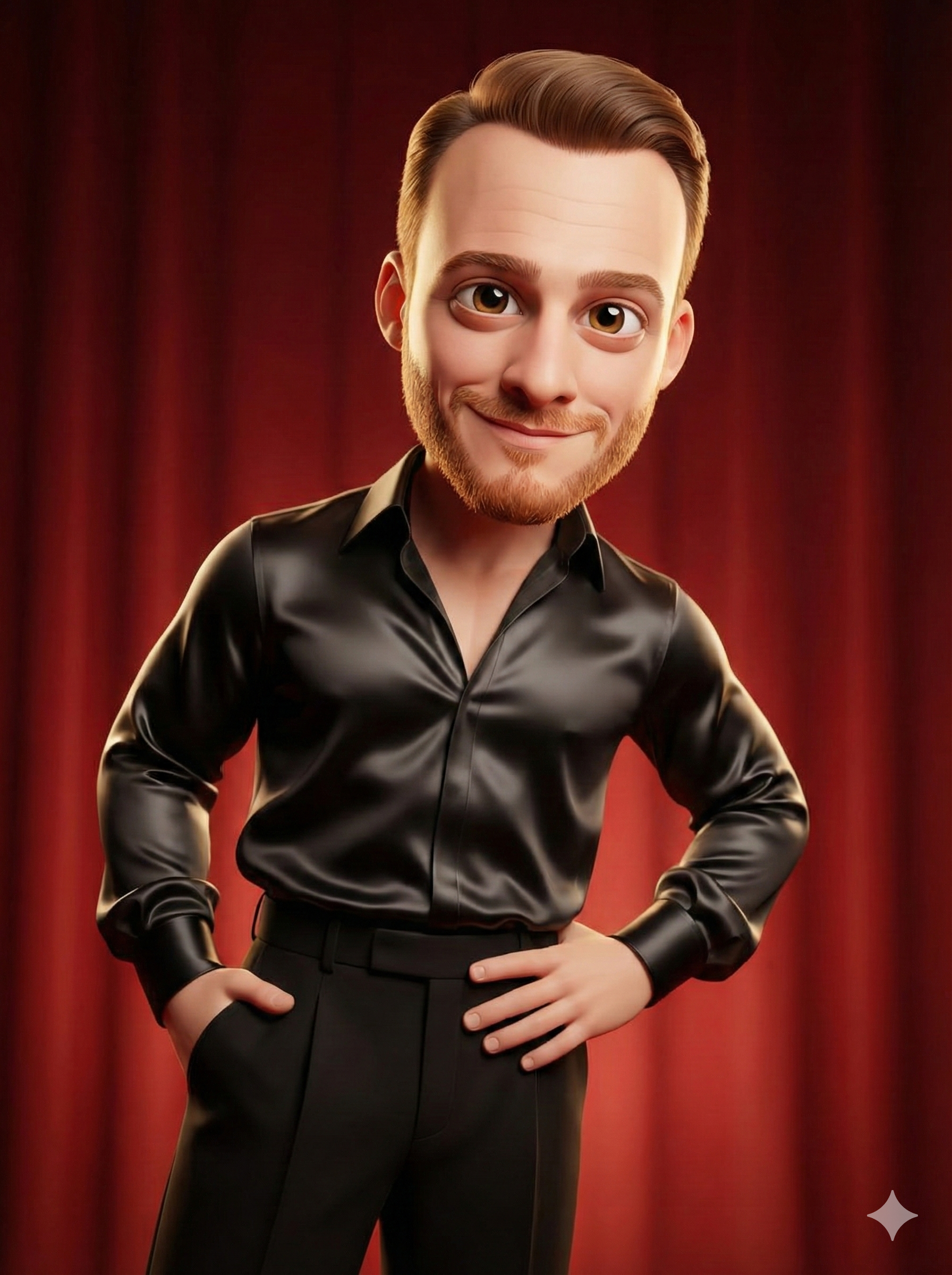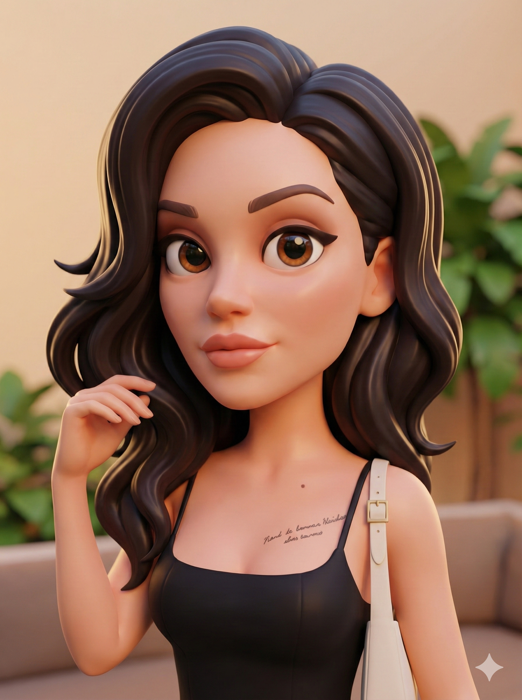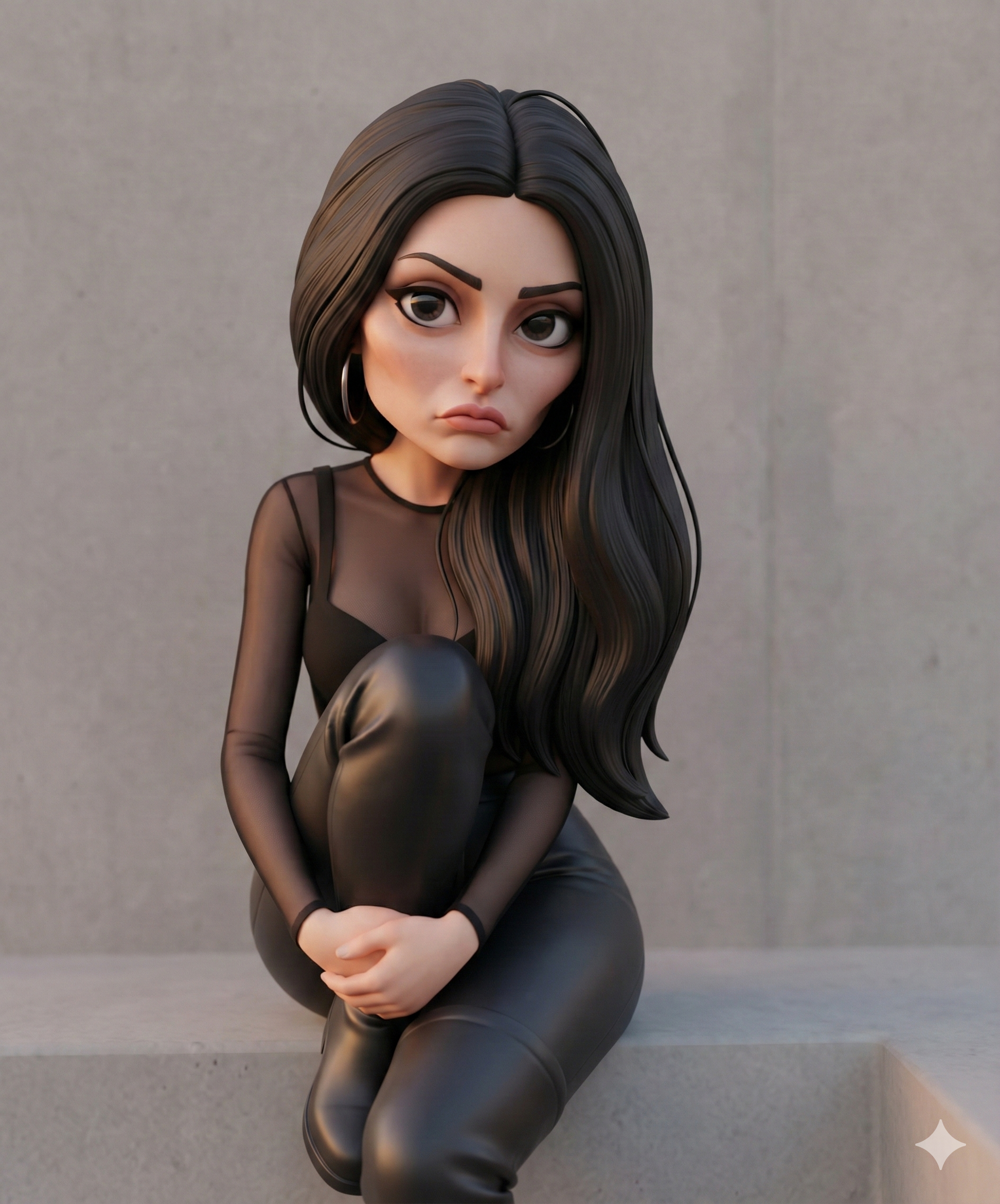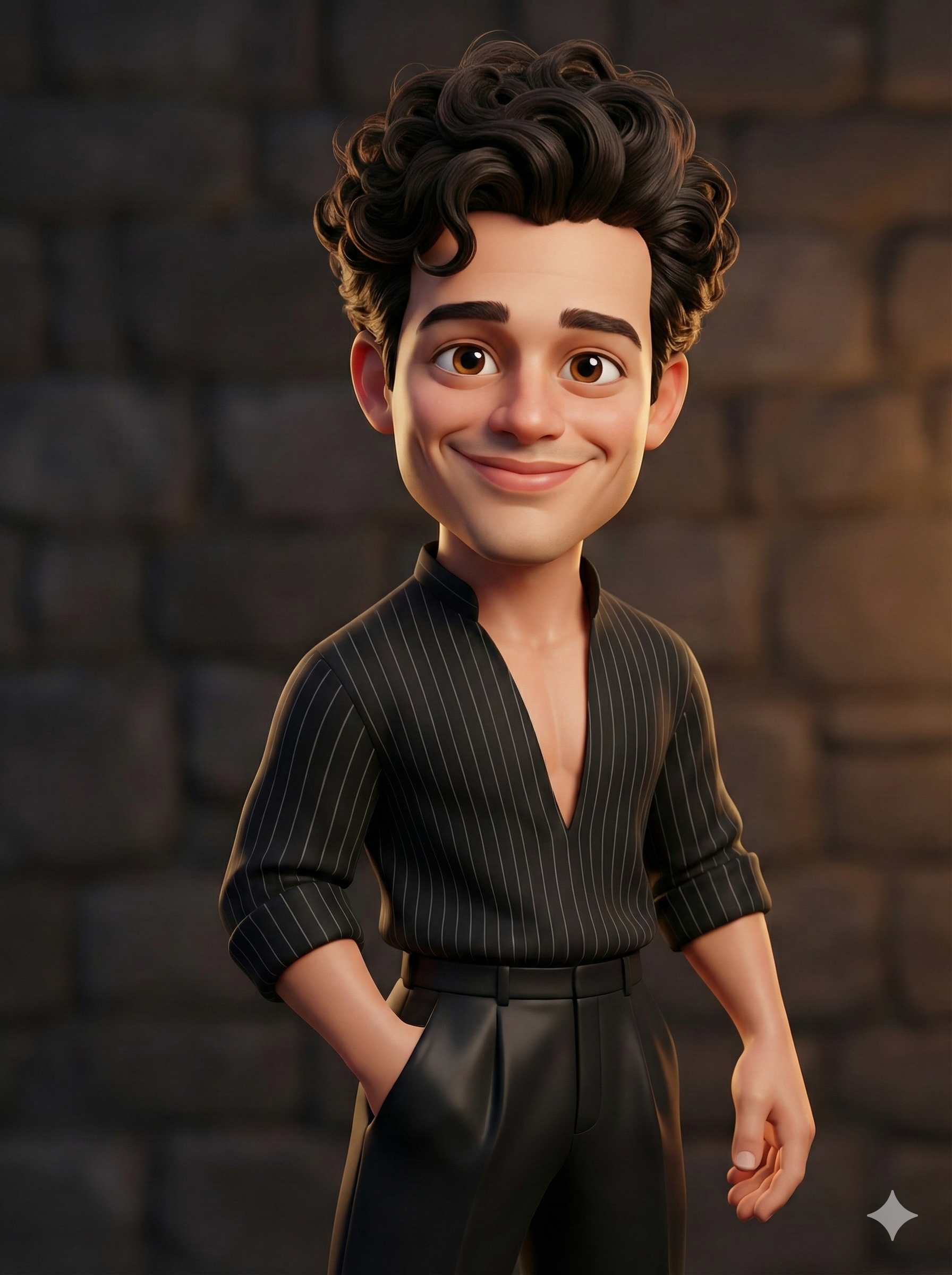 A highly stylized 3D caricature of, with an oversized head, expressive facial features, and playful exaggeration. Rendered in a smooth, polished style with clean materials and soft ambient lighting. Minimal background to emphasize the character’s charm and presence.