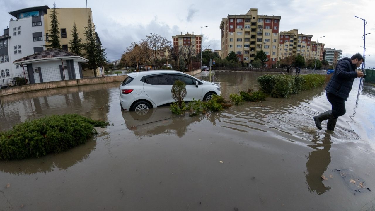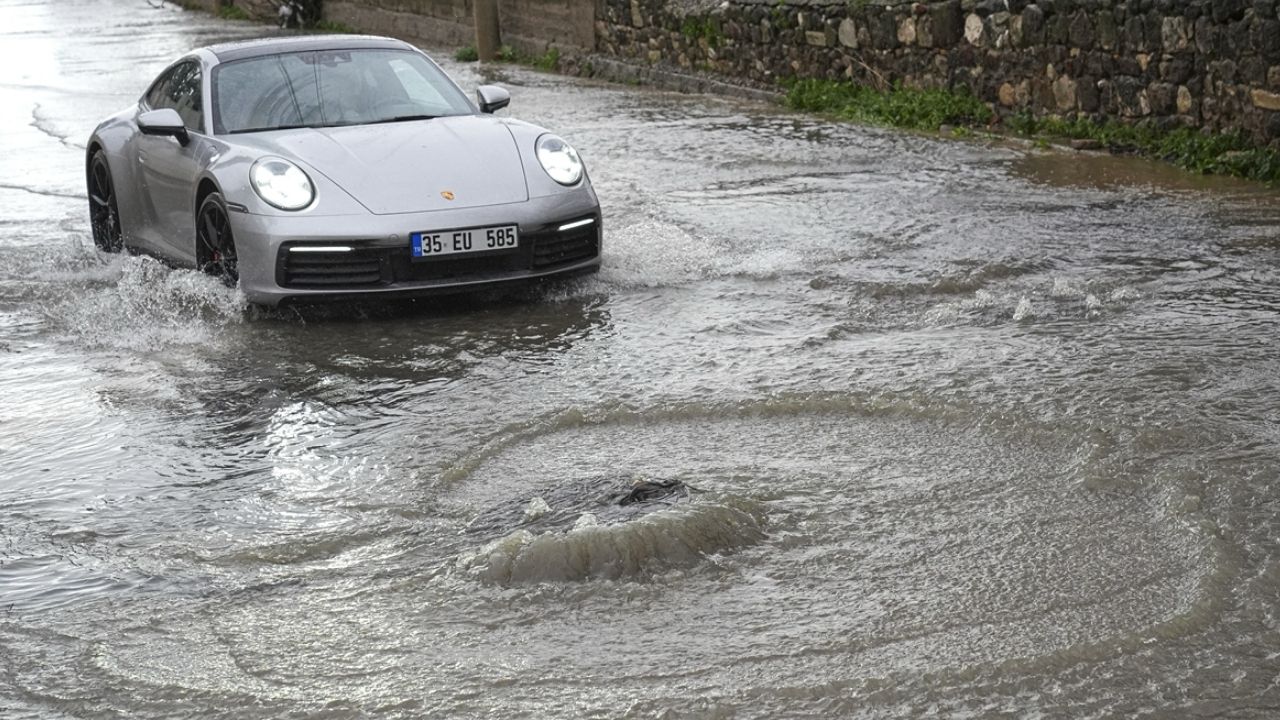 Manisa'da sağanak yağış nedeniyle cadde ve sokaklar göle döndü, birçok noktayı su bastı. Sular altında kalan yolda araçlar kaldırımdan ilerledi.