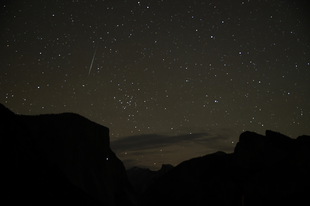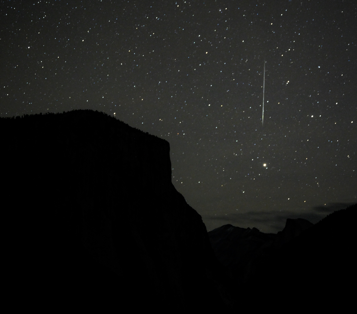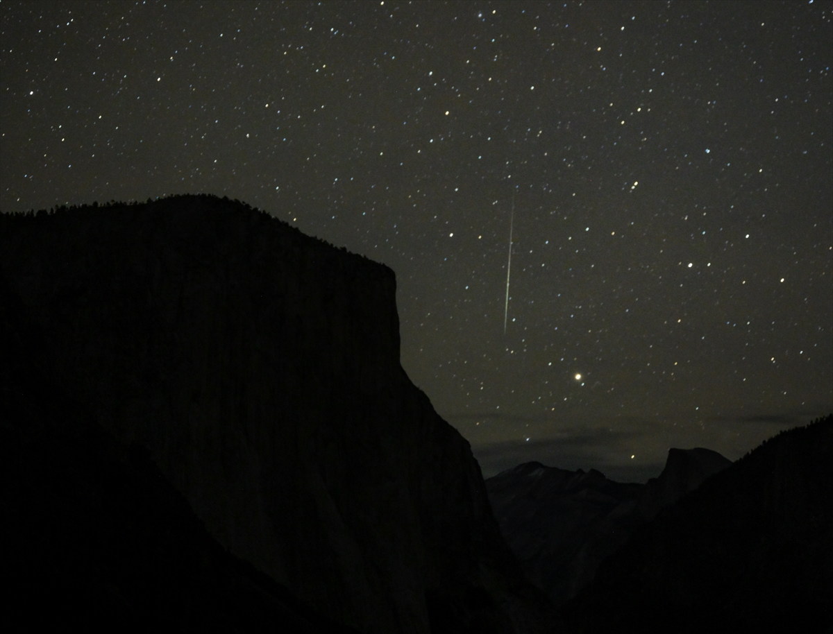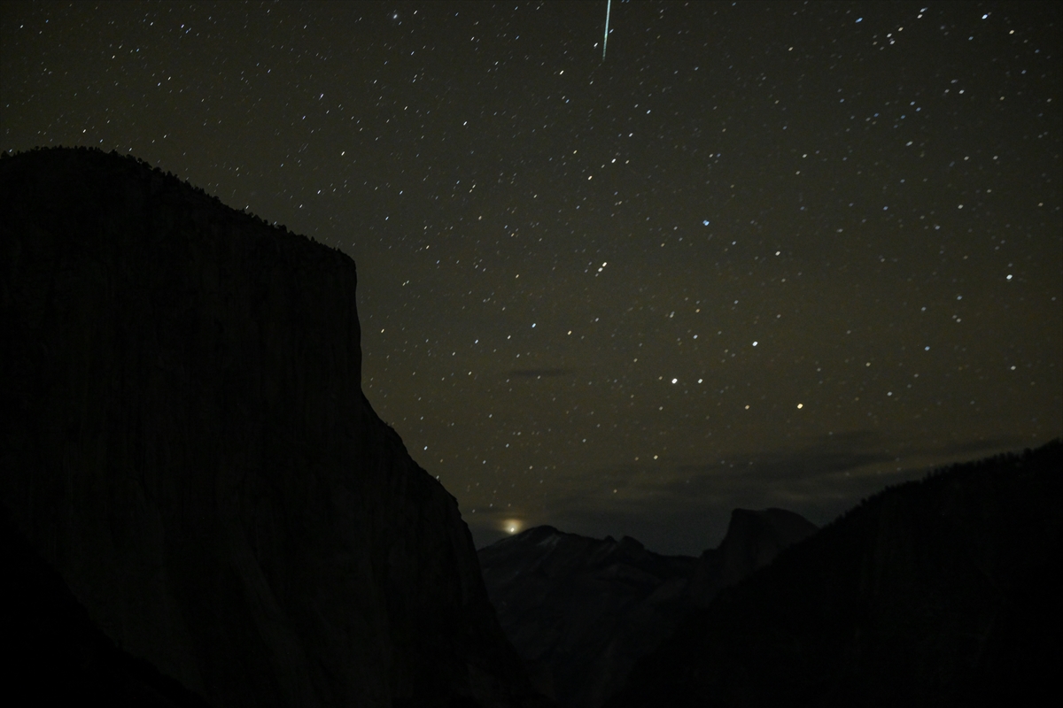 Gece boyunca gökyüzünde art arda beliren meteorlar, Half Dome’un siluetiyle birleşerek ortaya kartpostallık görüntüler çıkardı.