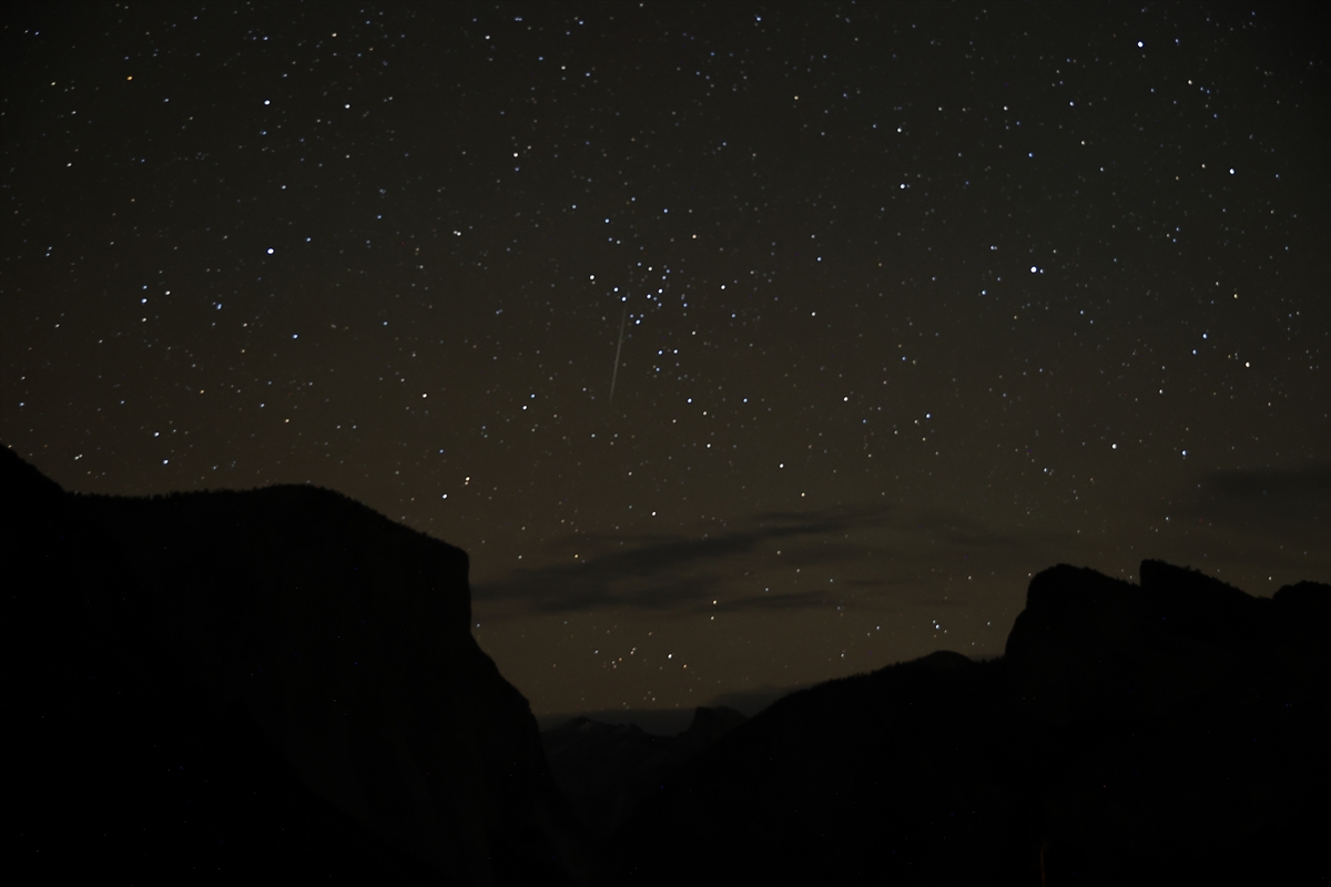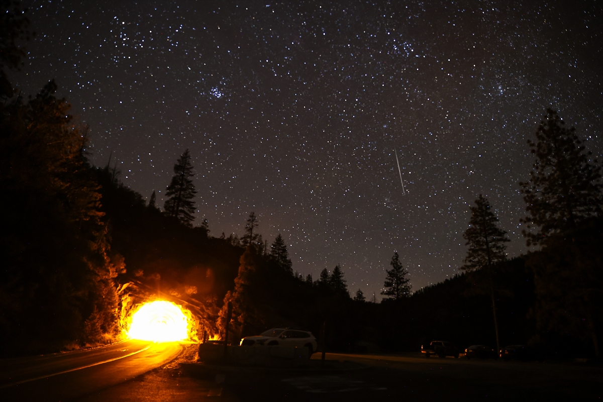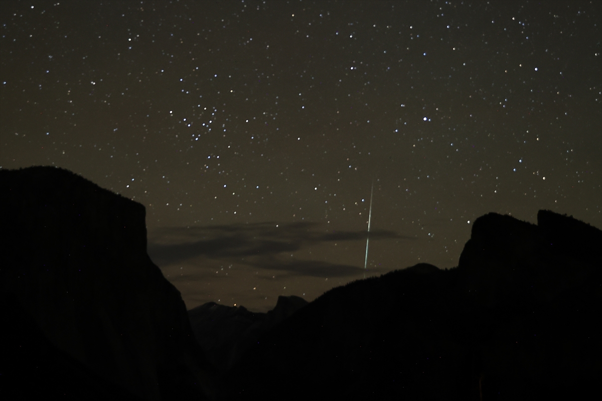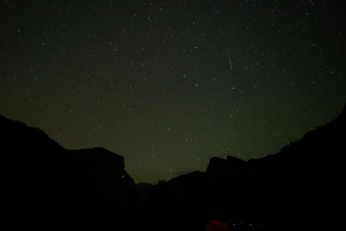 Gece boyunca gökyüzünde art arda beliren meteorlar, Half Dome’un siluetiyle birleşerek ortaya kartpostallık görüntüler çıkardı.
