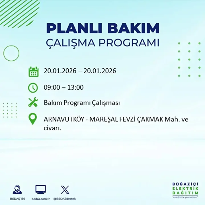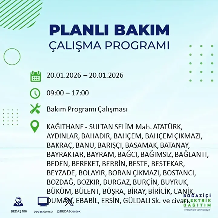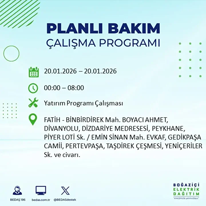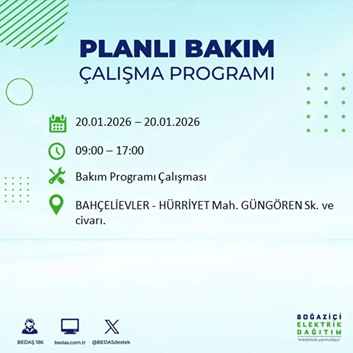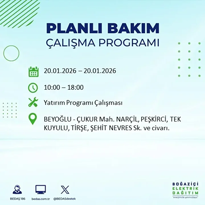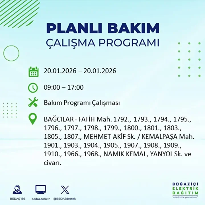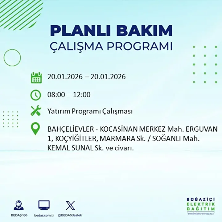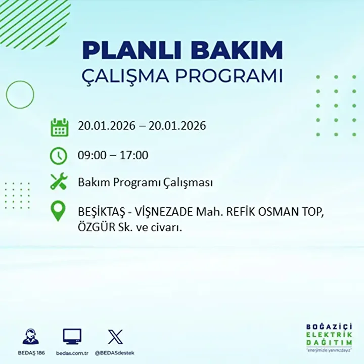 İşte 20 Ocak 2026 Salı günü için açıklanan BEDAŞ elektrik kesintisi listesi;
