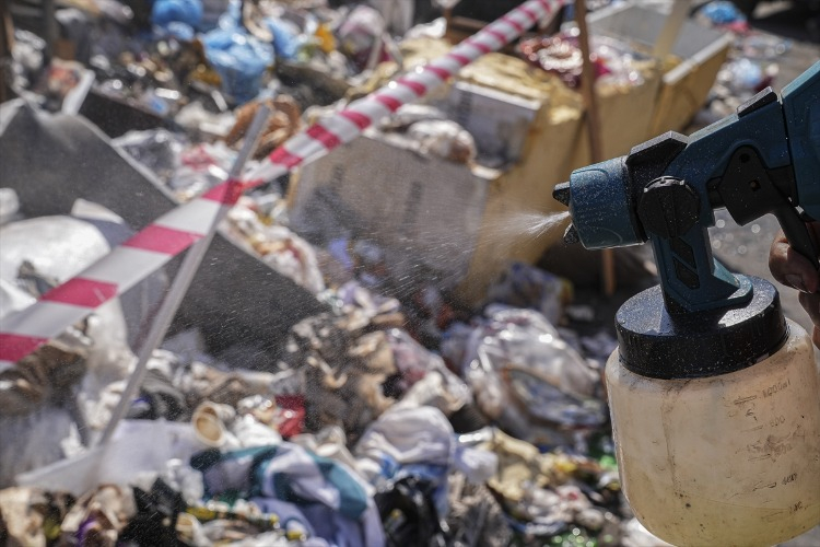 Buca ilçesi Seyhan Mahallesi''nde esnaflar, çöp yığınlarını mazotla ıslatarak haşereleri uzaklaştırmayı amaçlarken, aynı zamanda atıkların yol kenarına taşmaması için etrafına şerit çekmeyi tercih etti.