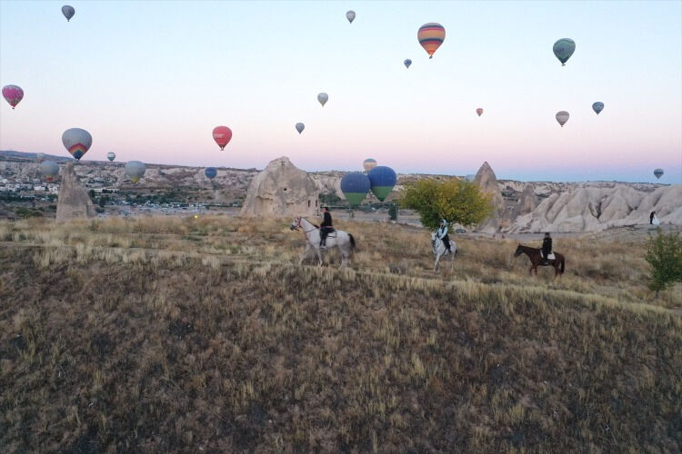 UNESCO Dünya Mirası Listesi''ndeki Kapadokya''da, milyonlarca yıl önce oluşan jeolojik şekilleri kuşbakışı izlemek isteyen turistler sıcak hava balon turuna ilgi gösterdi.