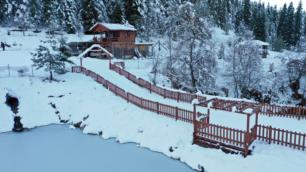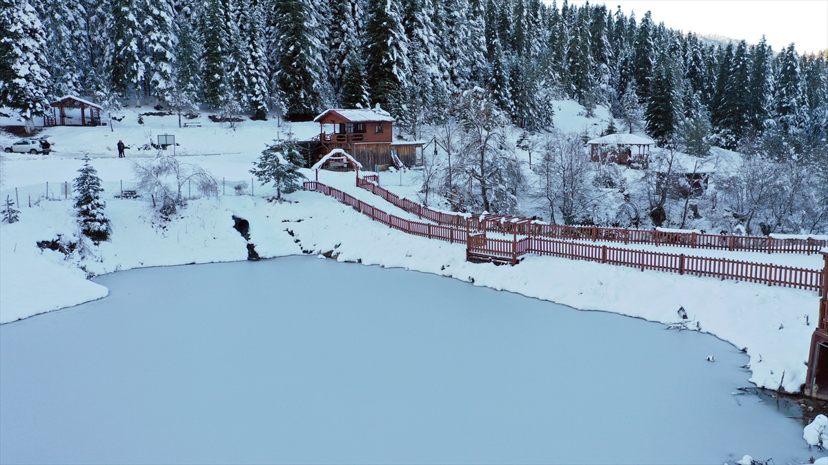 İlçe merkezine 35 kilometre mesafede, 1250 metre rakımda yer alan orman parkındaki gölet ve kar manzarası dron ile görüntülendi.