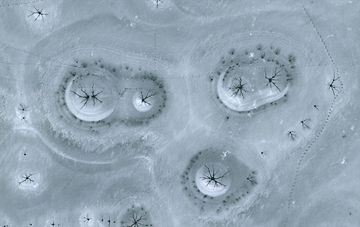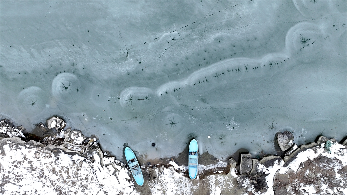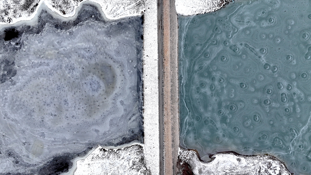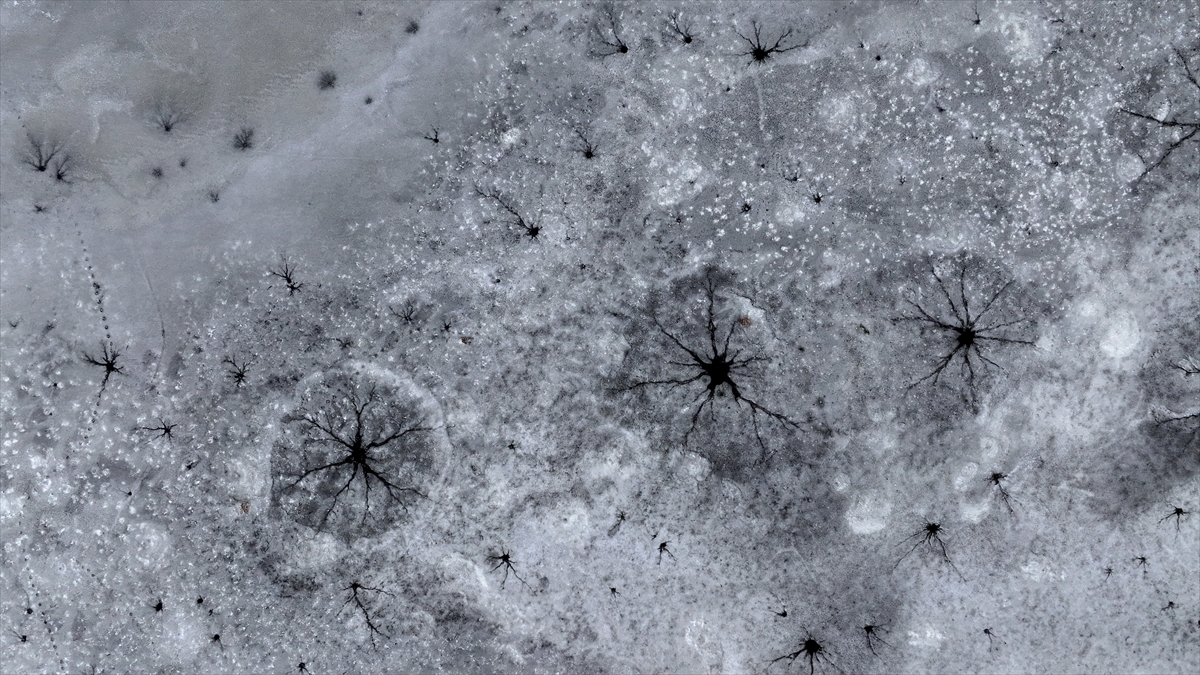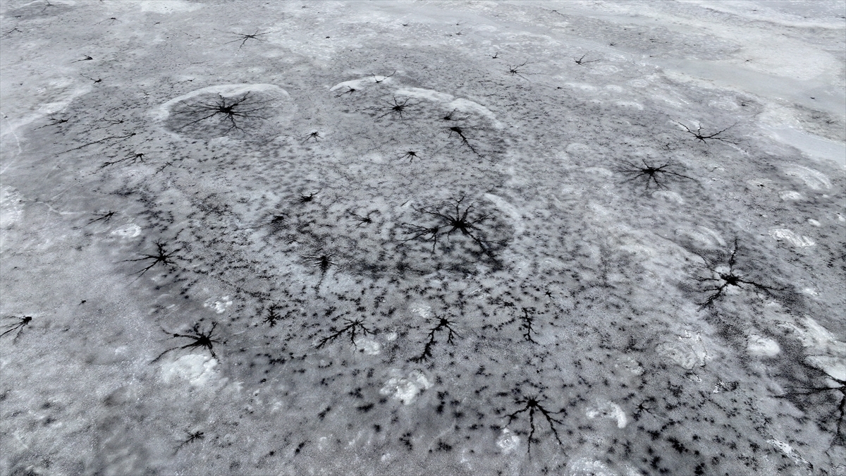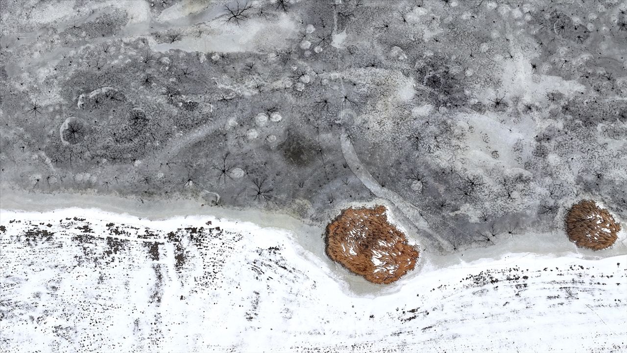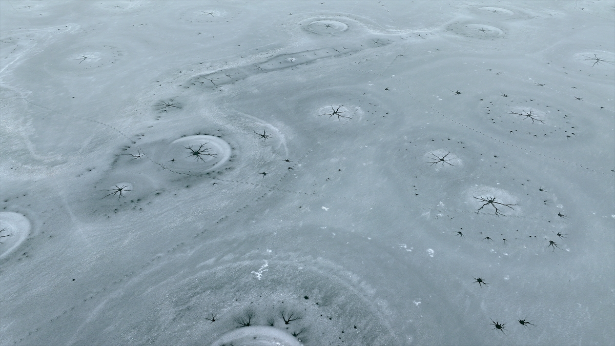 Bölgeyi havadan görüntüleyen dron kamerası, göl yüzeyinde oluşan eşsiz desenleri kaydetti. Donan yüzeyde oluşan halka şeklindeki buz yapıları ve merkezden dışarıya doğru yayılan kılcal çatlaklar, görenleri hayran bıraktı.