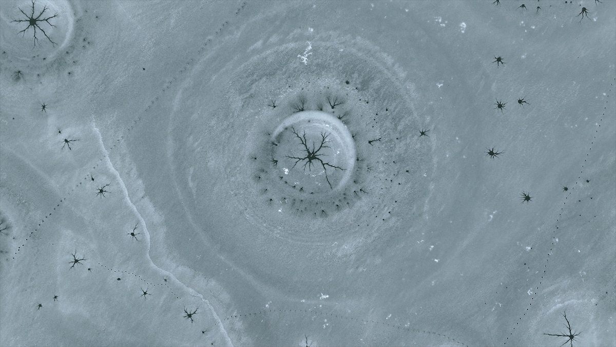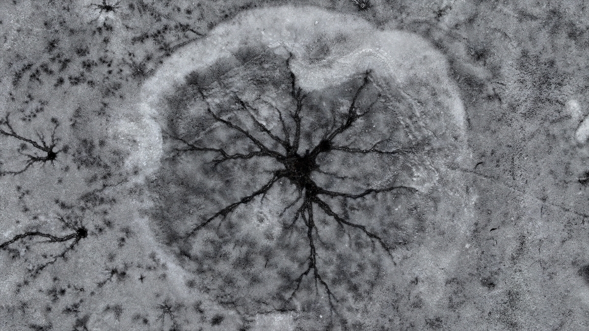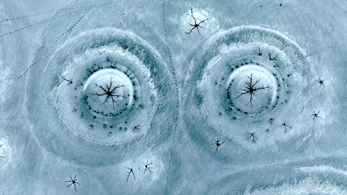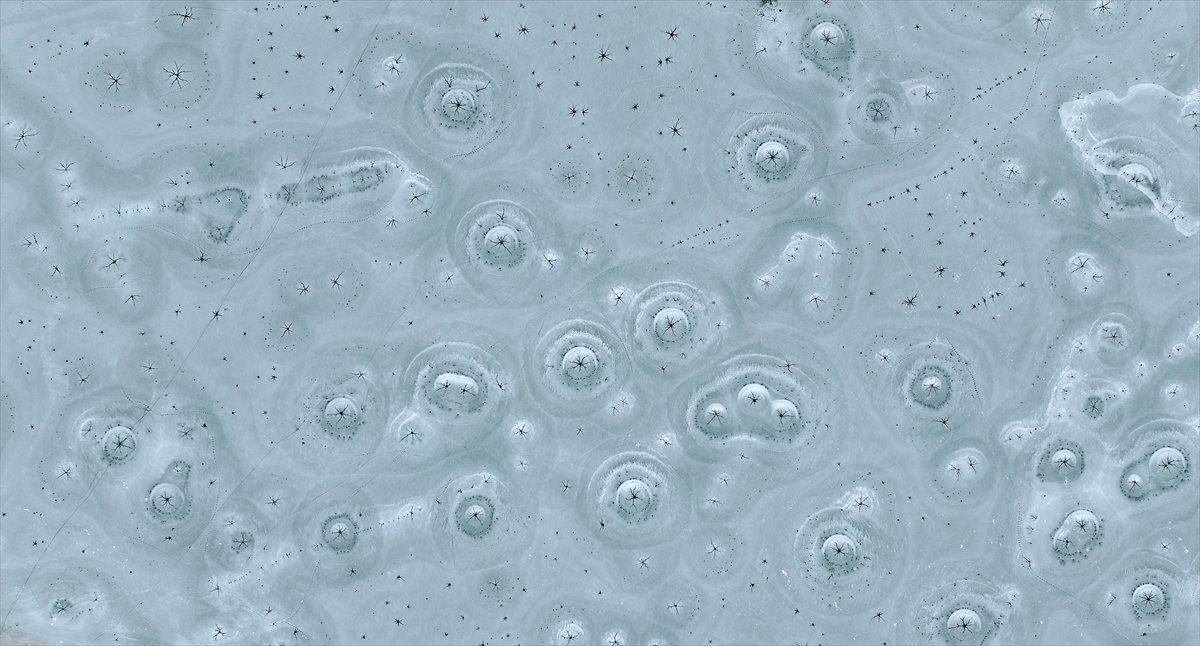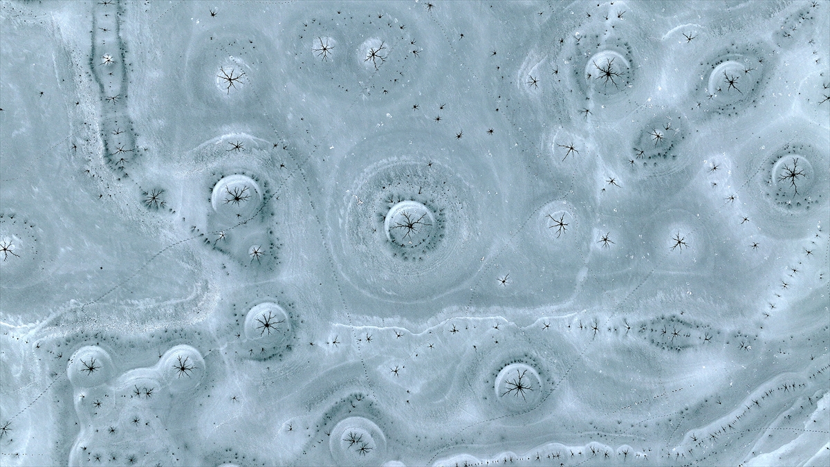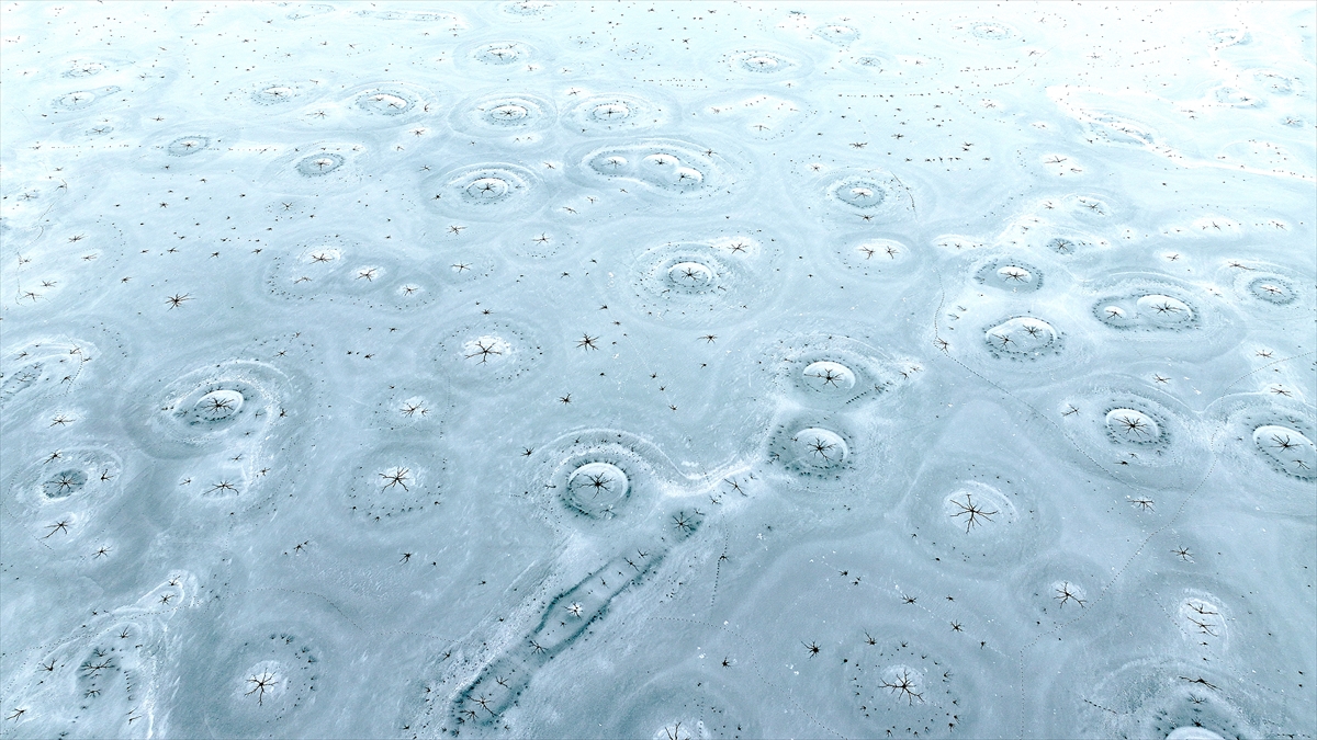 onan yüzeyde oluşan halka şeklindeki buz yapıları ve merkezden dışarıya doğru yayılan kılcal çatlaklar, görenleri hayran bıraktı.