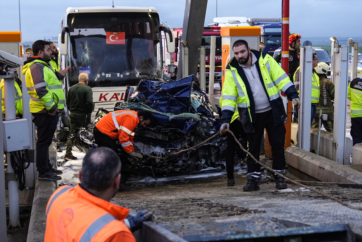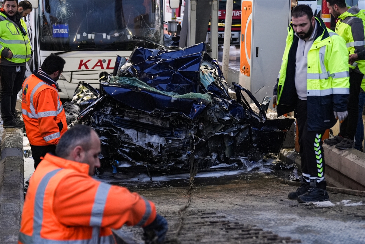 Kuzey Marmara Otoyolu'nun Kınalı Gişeleri'nde 59 ALV 478 plakalı otobüs, 59 ADN 734 plakalı otomobile çarpmış, otomobil gişe ile otobüs arasında sıkışmıştı.