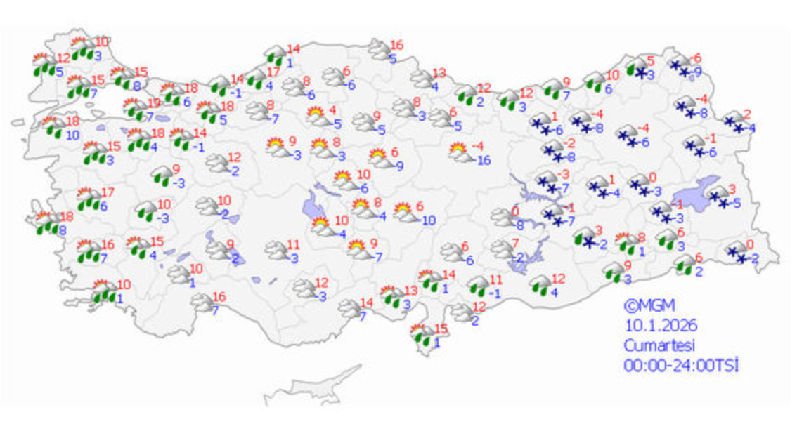 Kıyı kesimleri, Marmara ve Ege ile Güneydoğu Anadolu’nun güneyinde yağmur ve sağanak, yurdun doğusunda karla karışık yağmur ve kar şeklinde olması beklenen yağışların, Trakya'nın kuzey ve batısı, Ege ve Doğu Karadeniz kıyıları ile Hakkari ve Ordu çevrelerinde yer yer kuvvetli olacağı tahmin ediliyor.