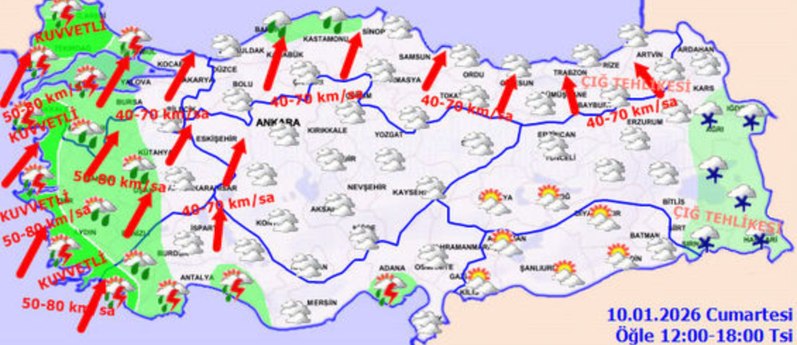 Rüzgarın yurt genelinde güneyli yönlerden hafif ve orta kuvvette, yurdun kuzey ve batı kesimlerinde kuvvetli, Marmara, Ege, Batı Akdeniz, İç Anadolu'nun kuzey ve batısı ile Karadeniz'in iç kesimlerinde yer yer fırtına (40-80 km/sa) şeklinde eseceği tahmin ediliyor.