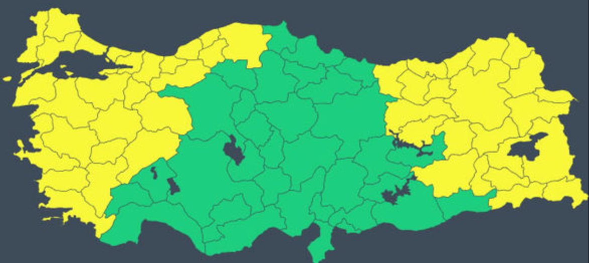 Meteoroloji'den "sarı" alarm uyarısında bulunulan iller şöyle: "İstanbul, İzmir, Bursa, Afyonkarahisar, Ağrı, Artvin, Aydın, Balıkesir, Bilecik, Bingöl, Bitlis, Bolu, Çanakkale, Denizli, Diyarbakır, Edirne, Erzincan, Erzurum, Eskişehir, Giresun, Gümüşhane, Hakkari, Kars, Kastamonu, Kırklareli, Kocaeli, Kütahya, Manisa, Muğla, Muş, Rize, Sakarya, Siirt, Tekirdağ, Trabzon, Tunceli, Uşak, Van, Zonguldak, Bayburt, Batman, Şırnak, Bartın, Ardahan, Iğdır, Yalova, Karabük ve Düzce."
