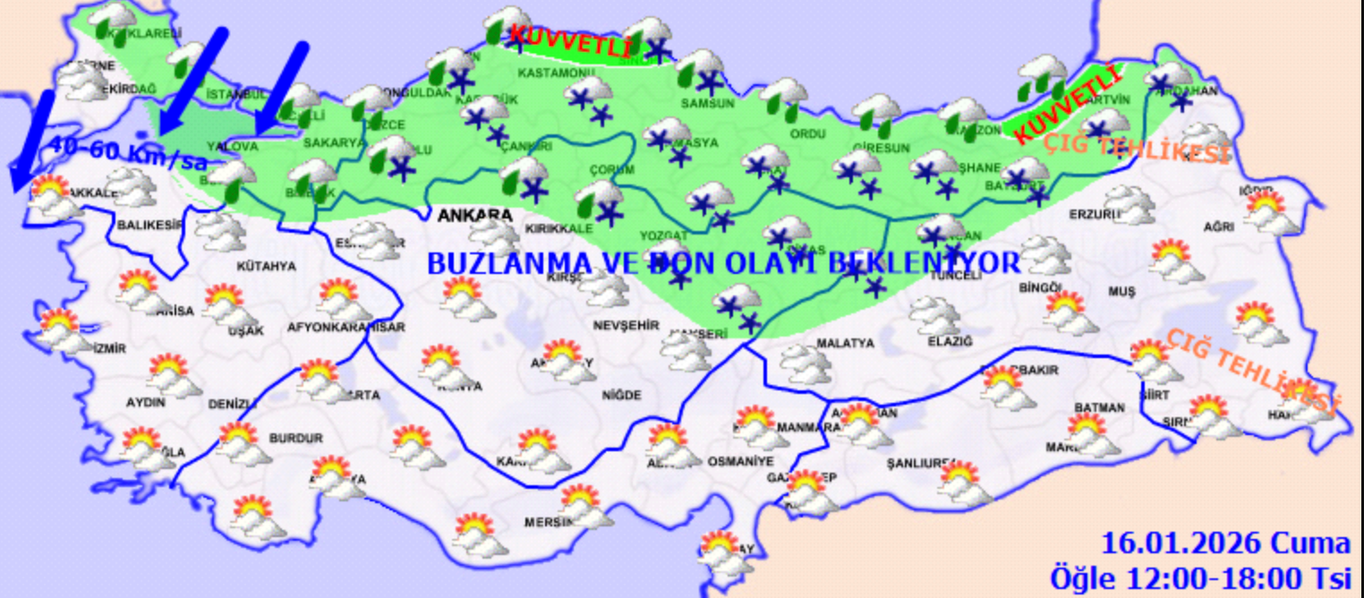 Meteoroloji Genel Müdürlüğü 16 Ocak Cuma günü için hava tahmin raporunu yayımladı. Buna göre, Marmara, İç Ege, İç Anadolu'nun kuzey ve doğusu, Karadeniz ve Doğu Anadolu'nun kuzey ve batısında sağanak yağış görülecek. Marmara ve kıyı kesimlerde yağmur ve karla karışık yağmur, iç ve yüksek kesimlerde kar şeklinde görülecek. Yağışlar Artvin, Rize, Sinop ve İnebolu çevrelerinde kuvvetlenecek. Hava sıcaklığı ise atı ve güney kesimlerde mevsim normallerinin 2-4 derece üzerinde, diğer bölgelerde ise mevsim normallerinde seyredecek.