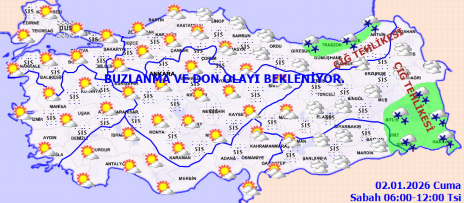 BUZLANMA VE DON OLAYI UYARISI: Ülkemizin kuzey, iç ve doğu kesimlerinde buzlanma ve don olayı beklendiğinden yaşanabilecek olumsuzluklara karşı dikkatli ve tedbirli olunması gerekmektedir.