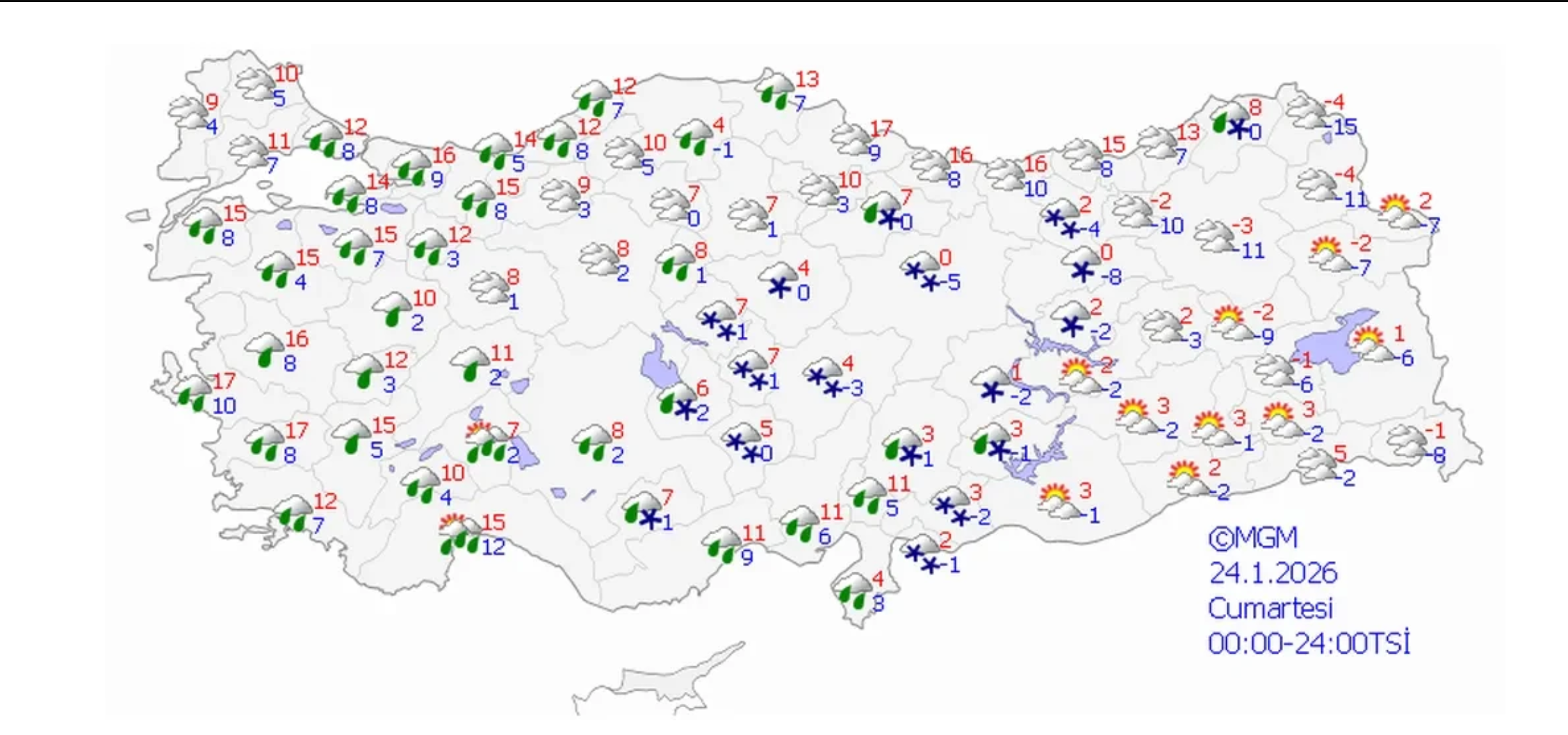 Meteoroloji Genel Müdürlüğü 24 Ocak Cumartesi günü için hava tahmin raporunu yayımladı. Yayımlanan rapora göre, Kıyı Ege, Akdeniz, İç Anadolu (Eskişehir ve Çankırı dışında), Batı Karadeniz (Bolu dışında), Doğu Anadolu'nun batısı ile Kocaeli, Sakarya, Çanakkale, Balıkesir, Bursa, Ordu, Tokat, Artvin, Gaziantep, Kilis ve Adıyaman çevrelerinin yağışlı geçecek. Yağışlar Doğu Anadolu'nun batısı ile Kahramanmaraş, Tokat, Artvin, Gaziantep, Kilis ve Adıyaman çevrelerinde karla karışık yağmur ve kar şeklinde görülecek. Sıcaklıklar ise Güneydoğu Anadolu'da mevsim normallerinin altında, diğer yerlerde mevsim normalleri civarında seyredecek.