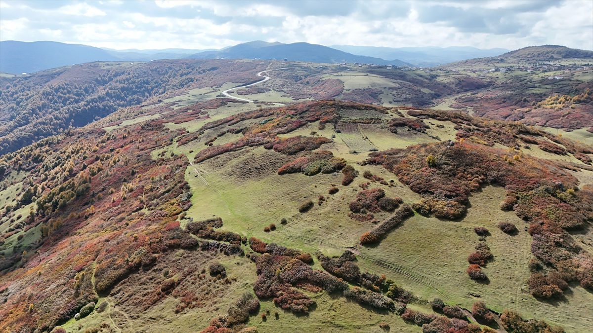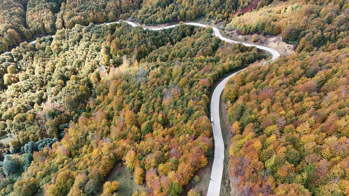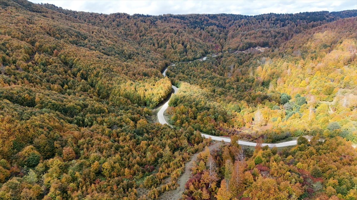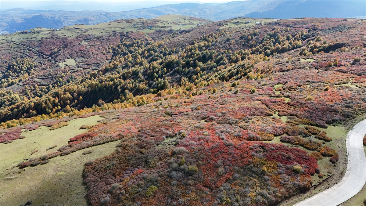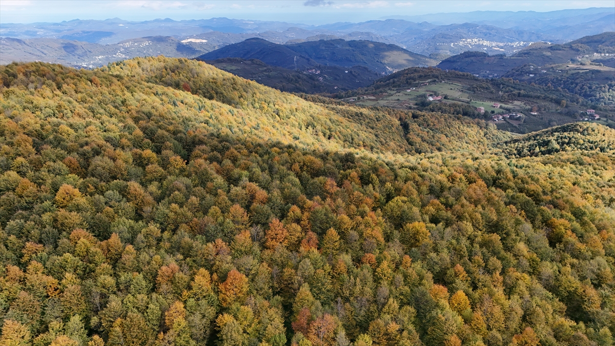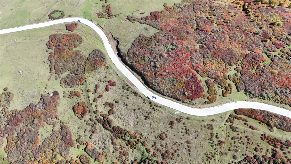 Sarı, kırmızı, kahverengi ve yeşilin tonlarına bürünen manzara havadan görüntülendi.