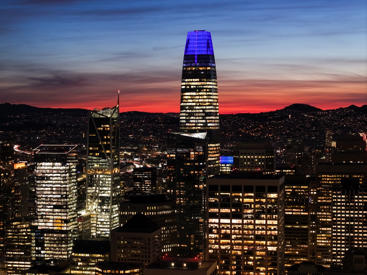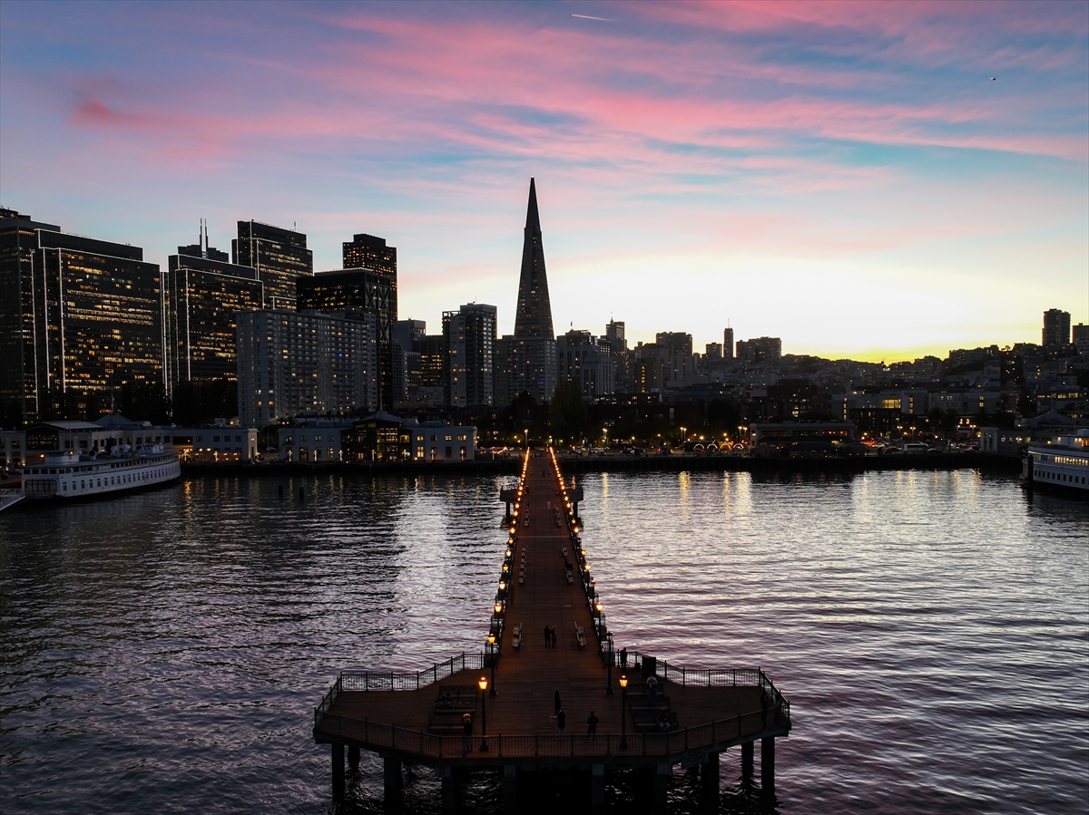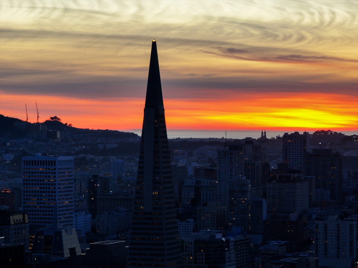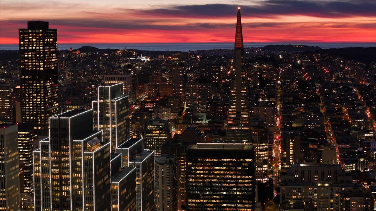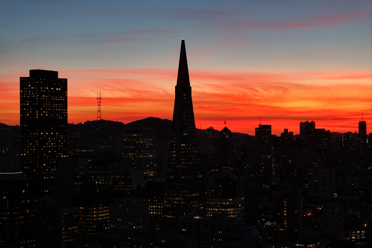 Kentin simgelerinden biri olan Transamerica Piramidi ve gökdelenler, batan güneşin oluşturduğu kızıl fonun önünde devasa birer silüet olarak yükseldi.