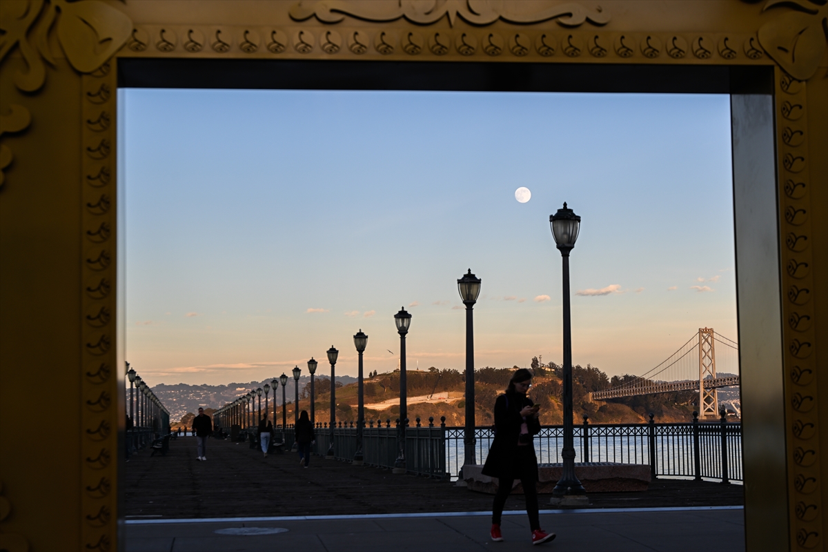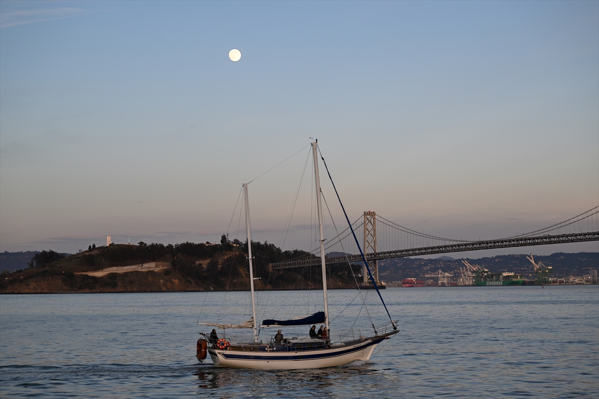 Güneşin vedasıyla eş zamanlı olarak gökyüzünde beliren Ay, San Francisco-Oakland Bay Köprüsü ile birlikte objektiflere yansıdı.