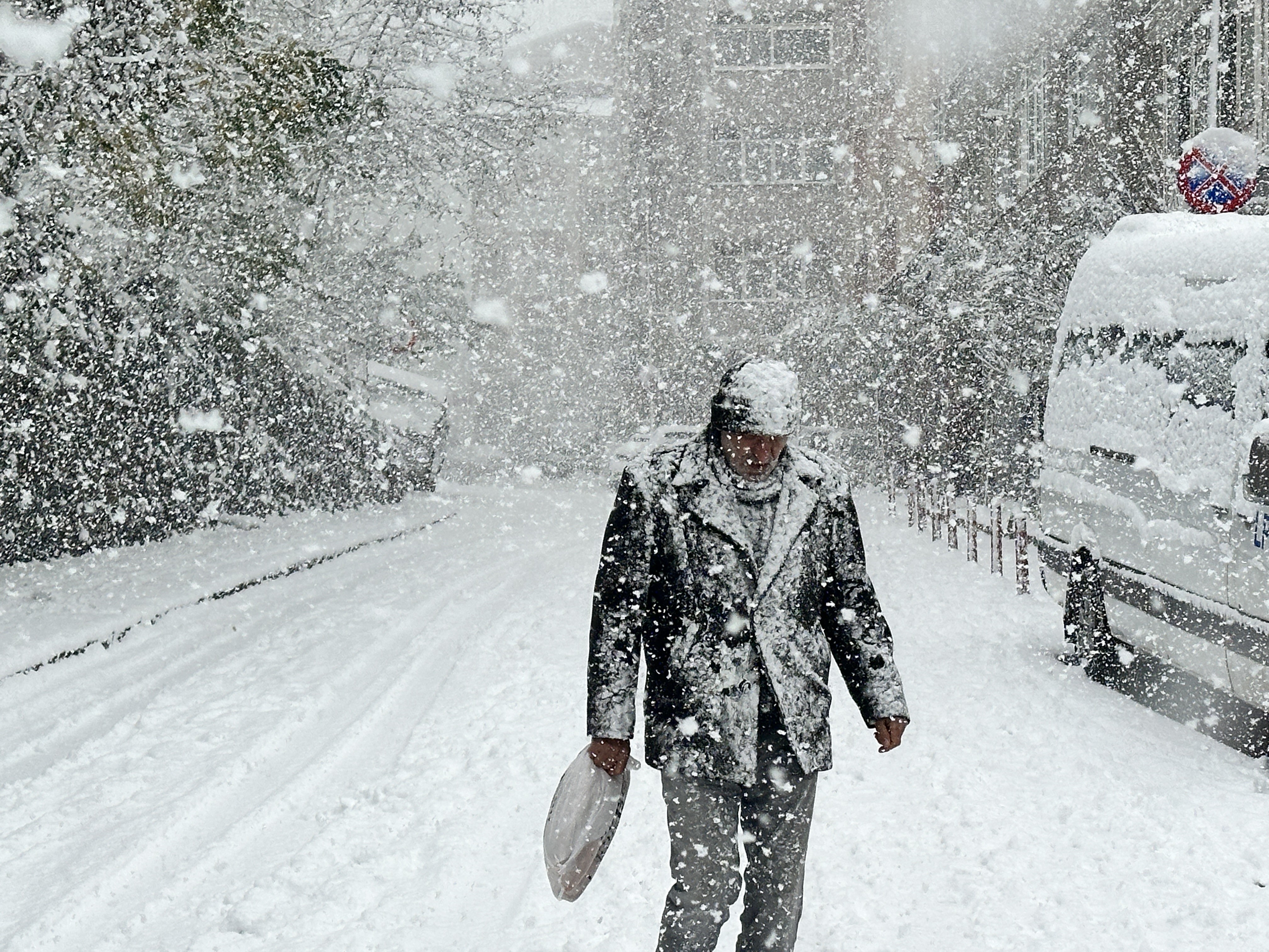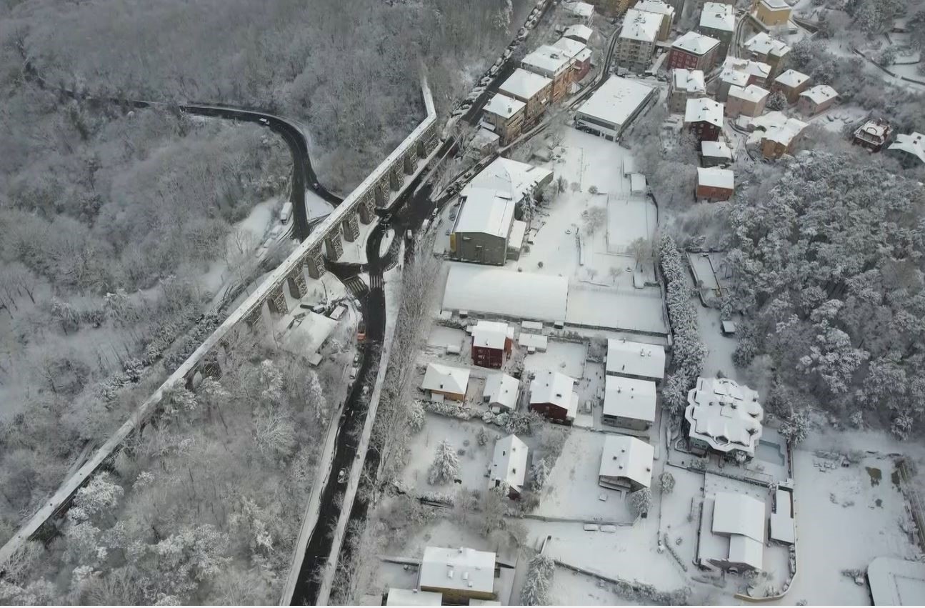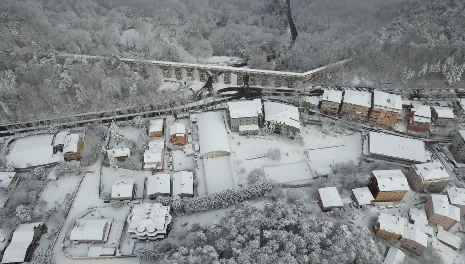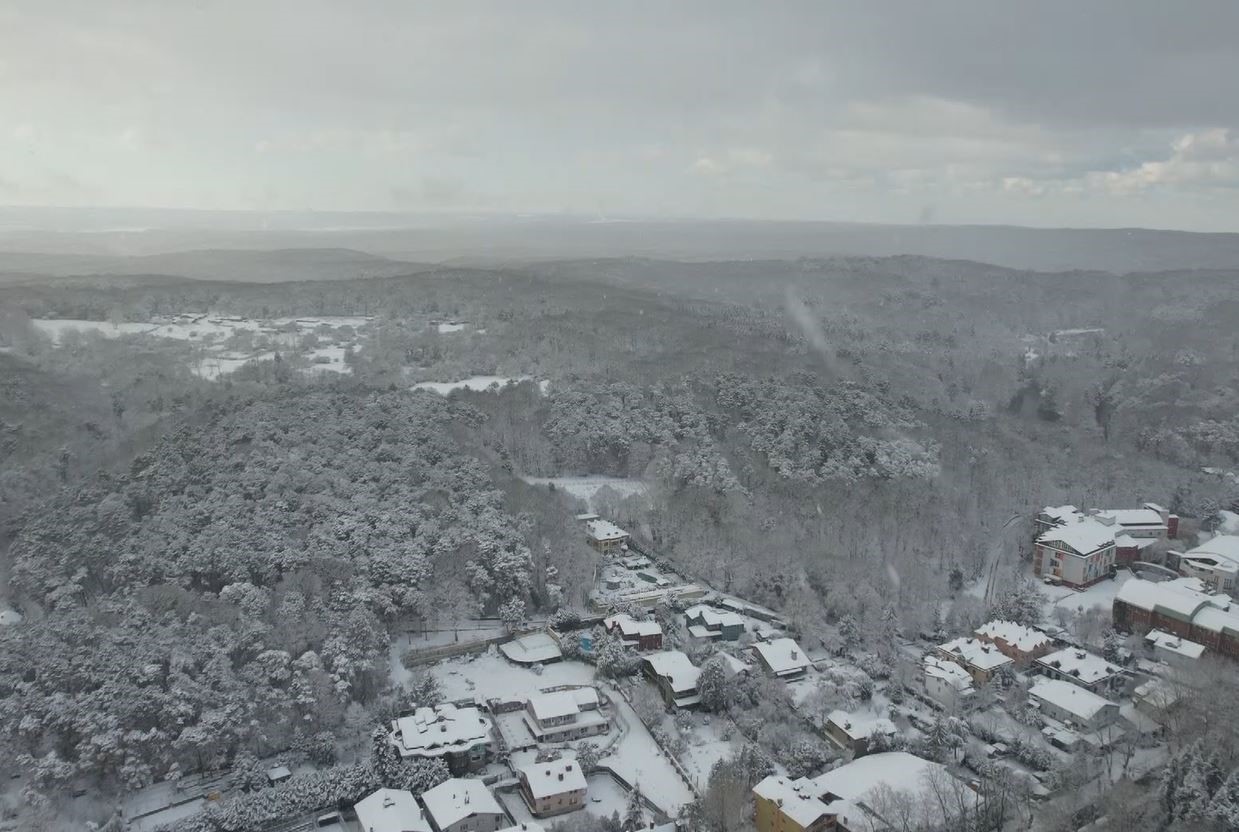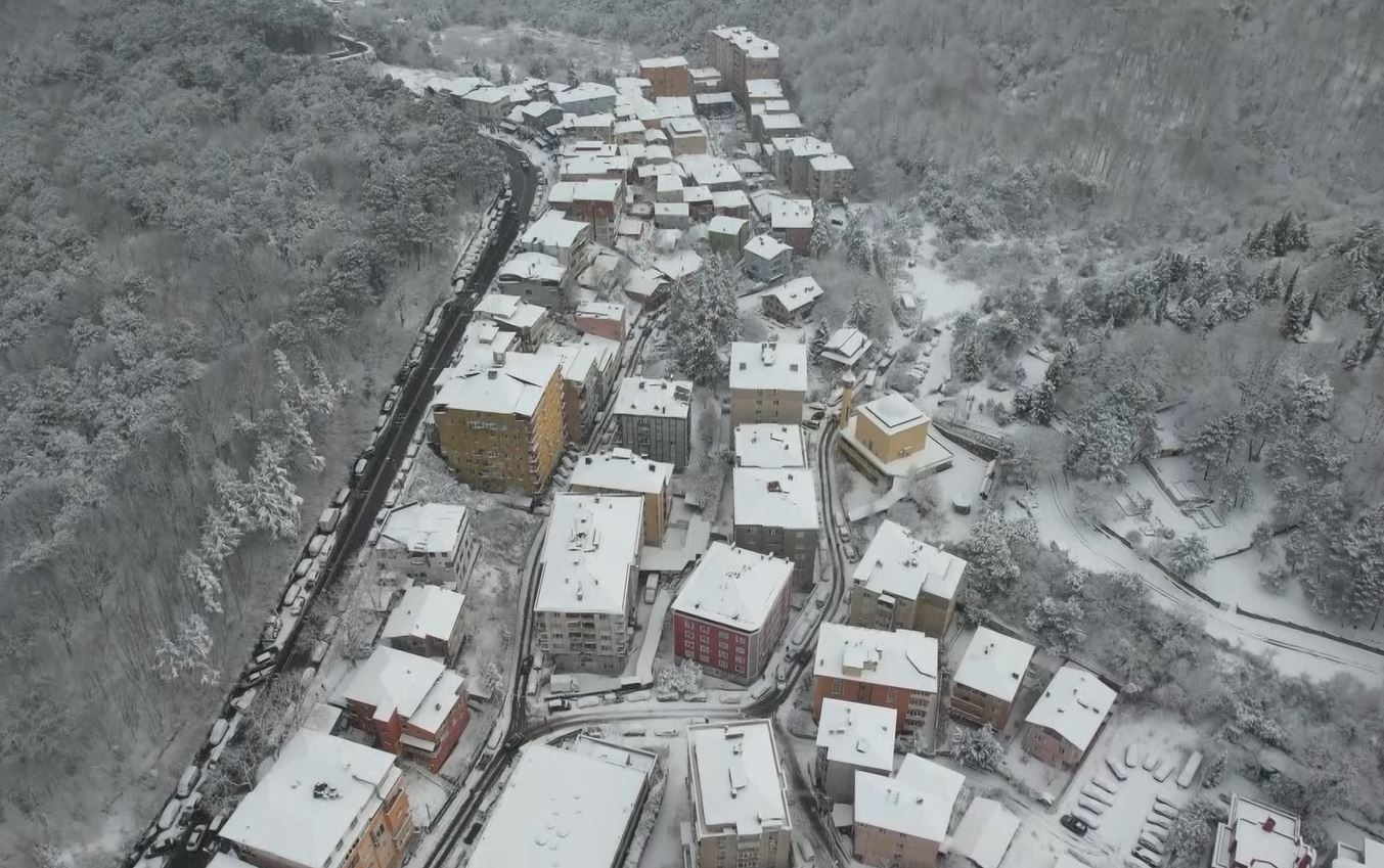 Görüntülerde çatıların üzerini kar kapladığı görülüyor.