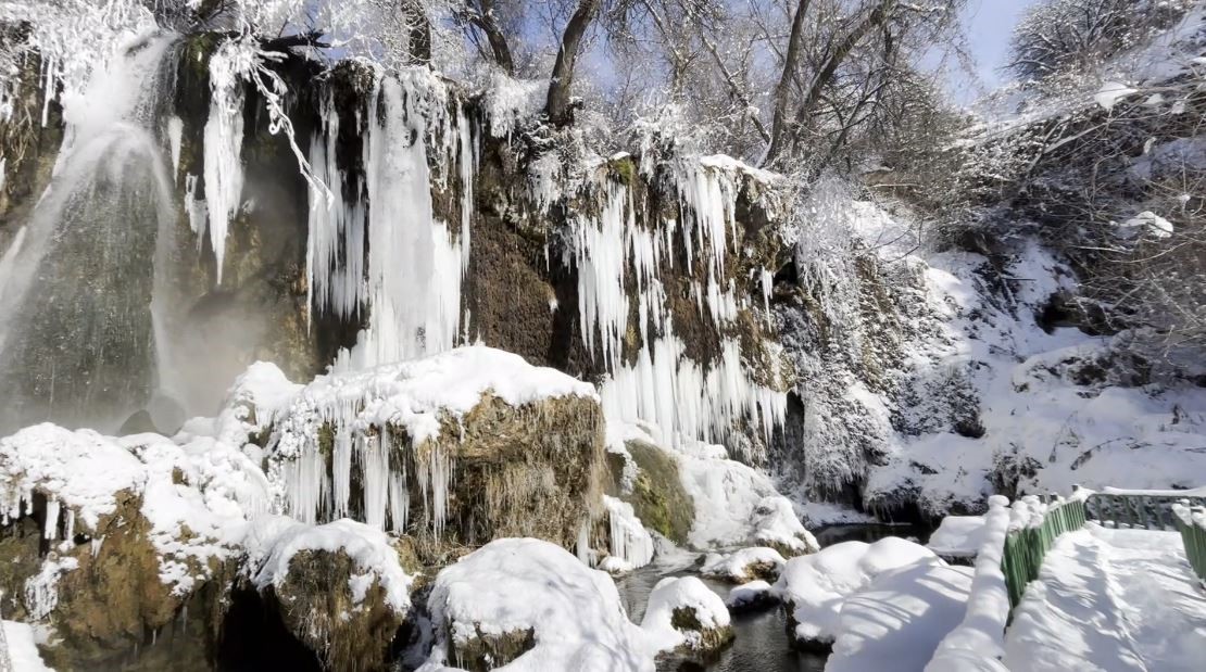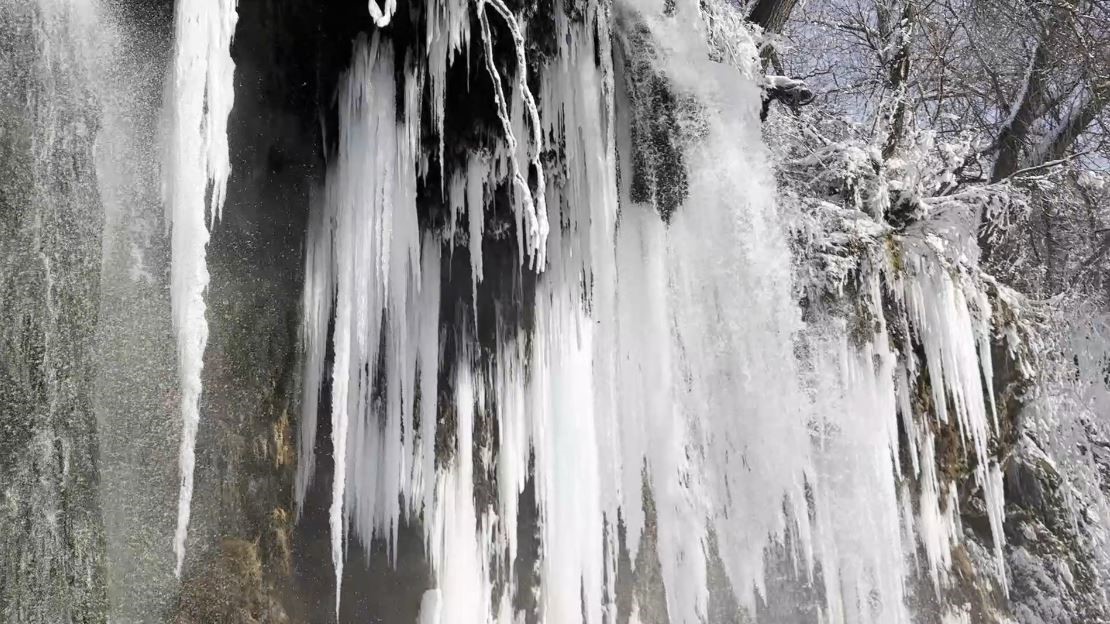Hava sıcaklığının eksi 20 dereceye kadar düştüğü beldedeki şelalede dev buz sarkıtları oluştu.
