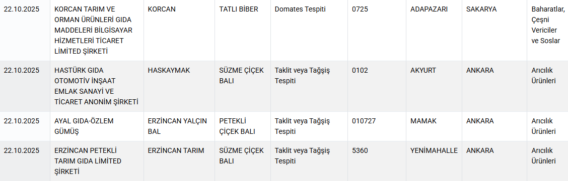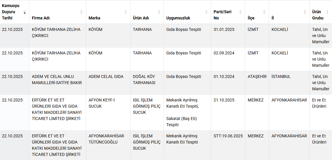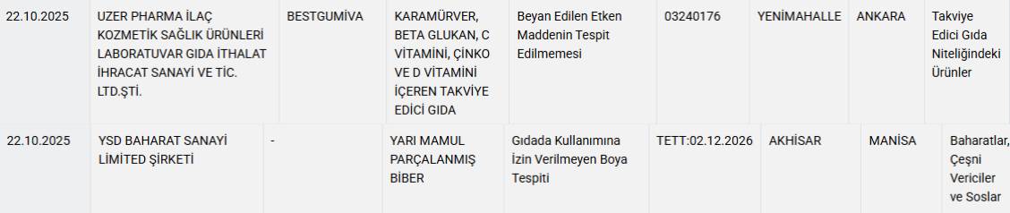 Bakanlık, söz konusu ürünlerin parti numaralarıyla birlikte tam listesini "guvenilirgida.tarimorman.gov.tr" adresinde yayımladı.
