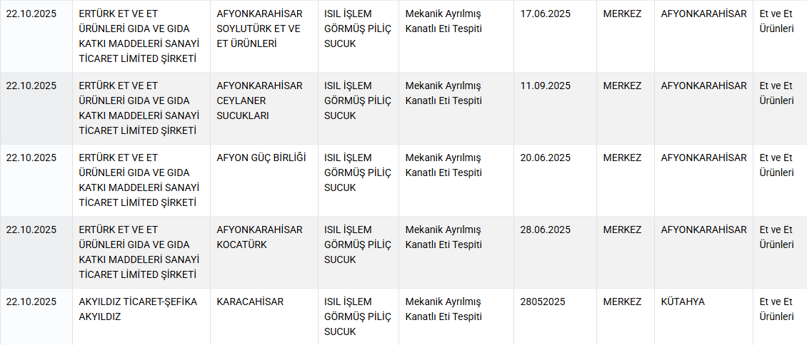 Bakanlık analizlerine göre, Afyonkarahisar, Kütahya ve Aksaray’da üretilen bazı sucuklarda mekanik ayrılmış kanatlı eti ve sakatat (baş, dil, taşlık) kullanıldığı belirlendi. Özellikle Afyon Keyf-i Sucuk, Tütüncüoğlu, Soylutürk, Güç Birliği ve Kocatürk gibi markaların ürünlerinde dana eti yerine bu maddelerin kullanıldığı tespit edildi.