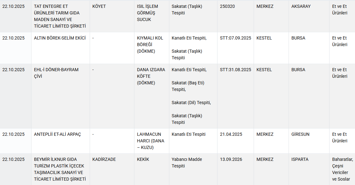 Ancak hile yalnızca sucuklarla sınırlı değil. Denetimler sonucunda bazı ürünlerde şu uygunsuzluklar saptandı: