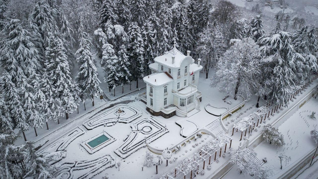 Etkili olan kar yağışının ardından şehir merkezindeki Atatürk Köşkü ve çevresi, beyaza büründü.