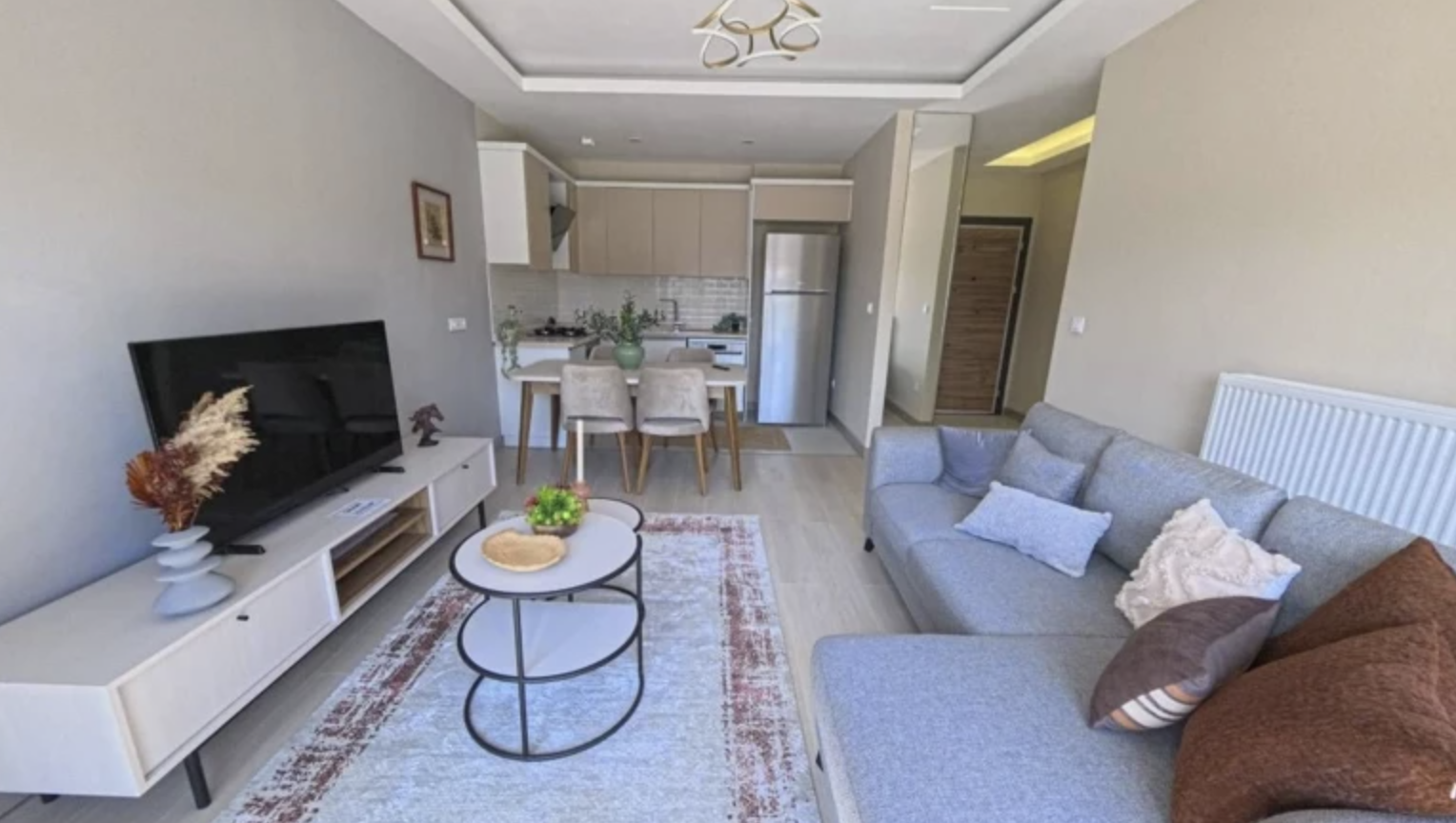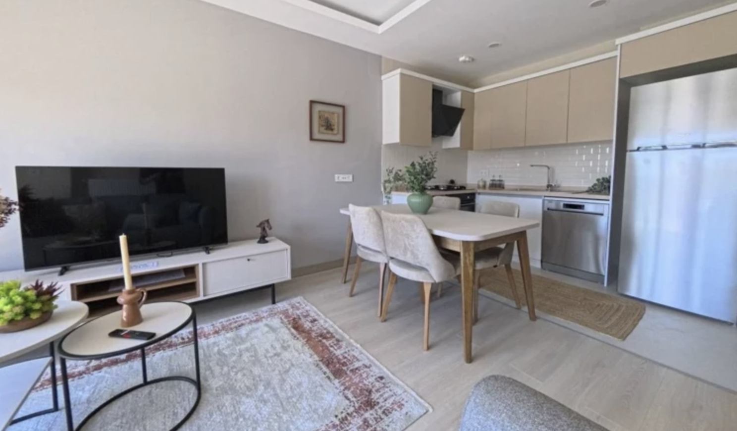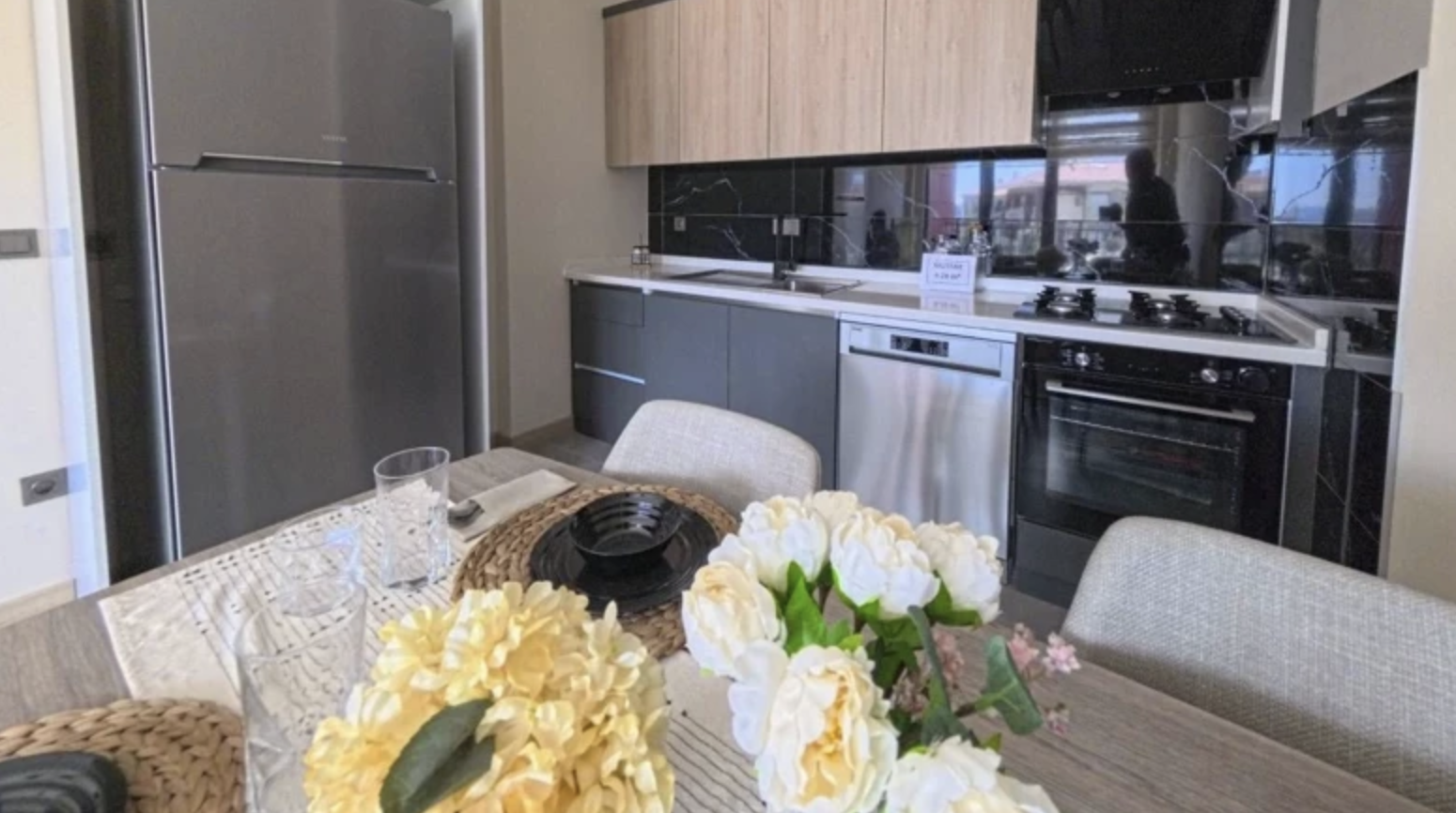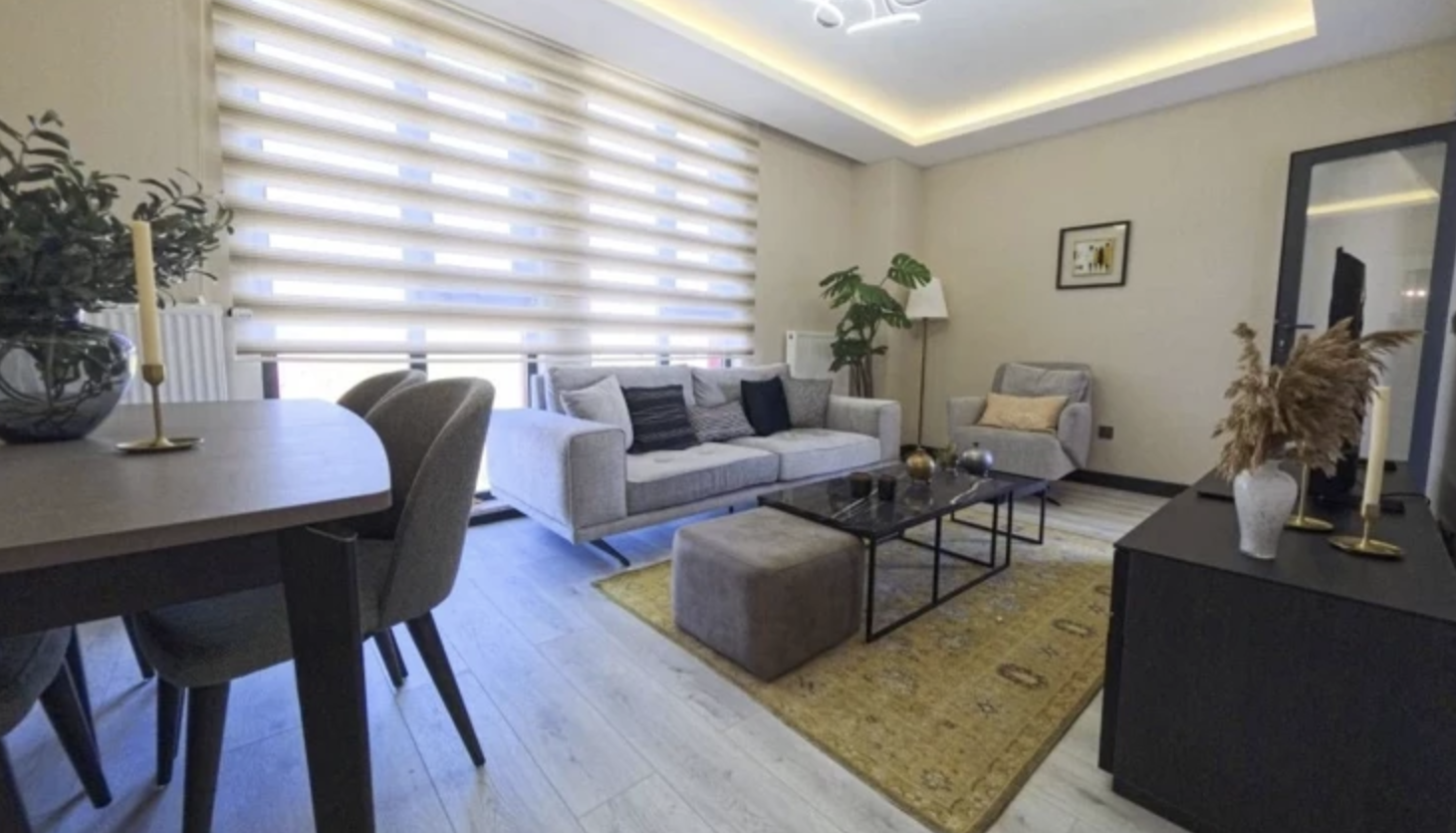 Açık mutfak ve salon birleşimi, alanın daha geniş ve ferah algılanmasını sağlarken, doğal ışığın etkin kullanımı dikkat çekti.