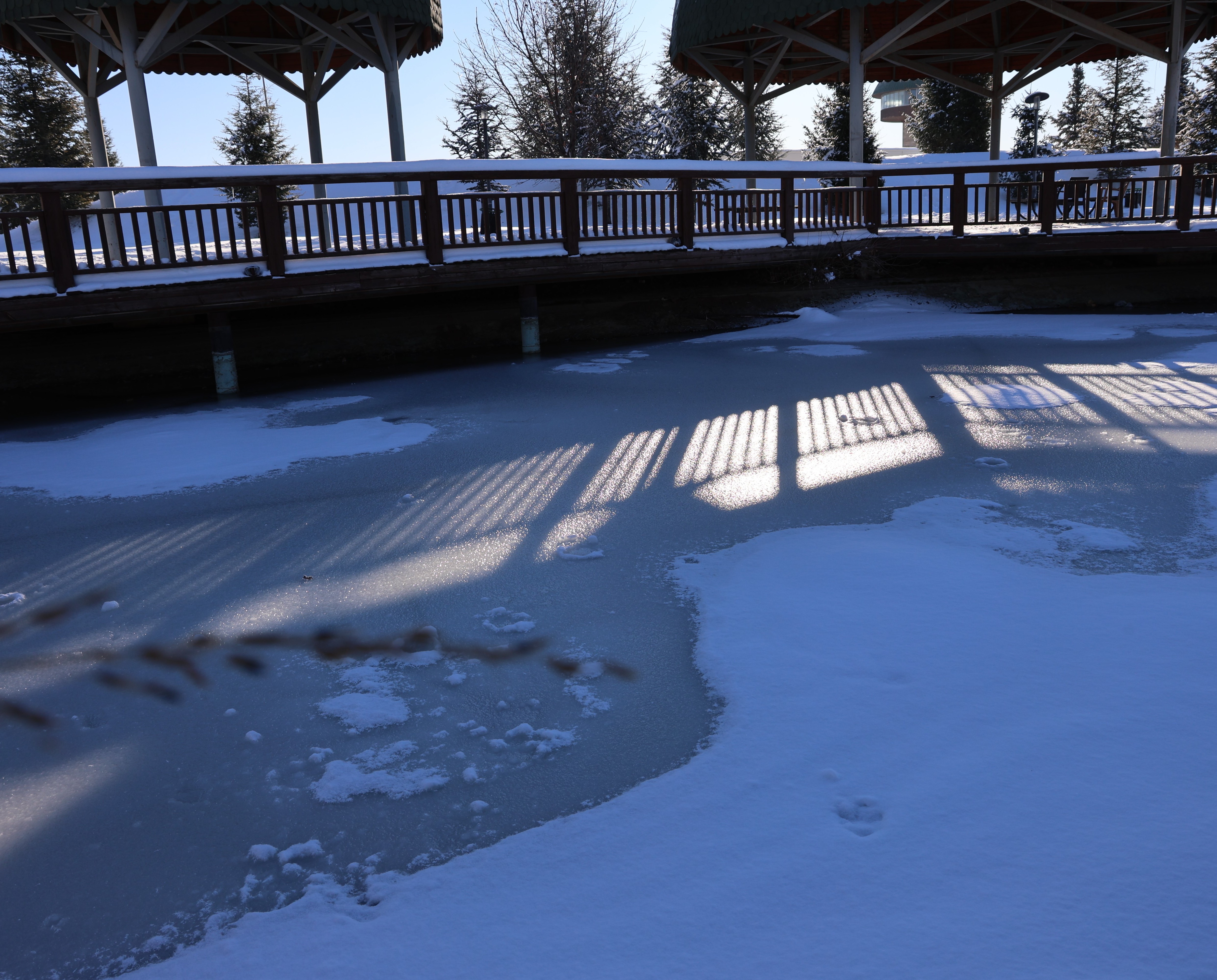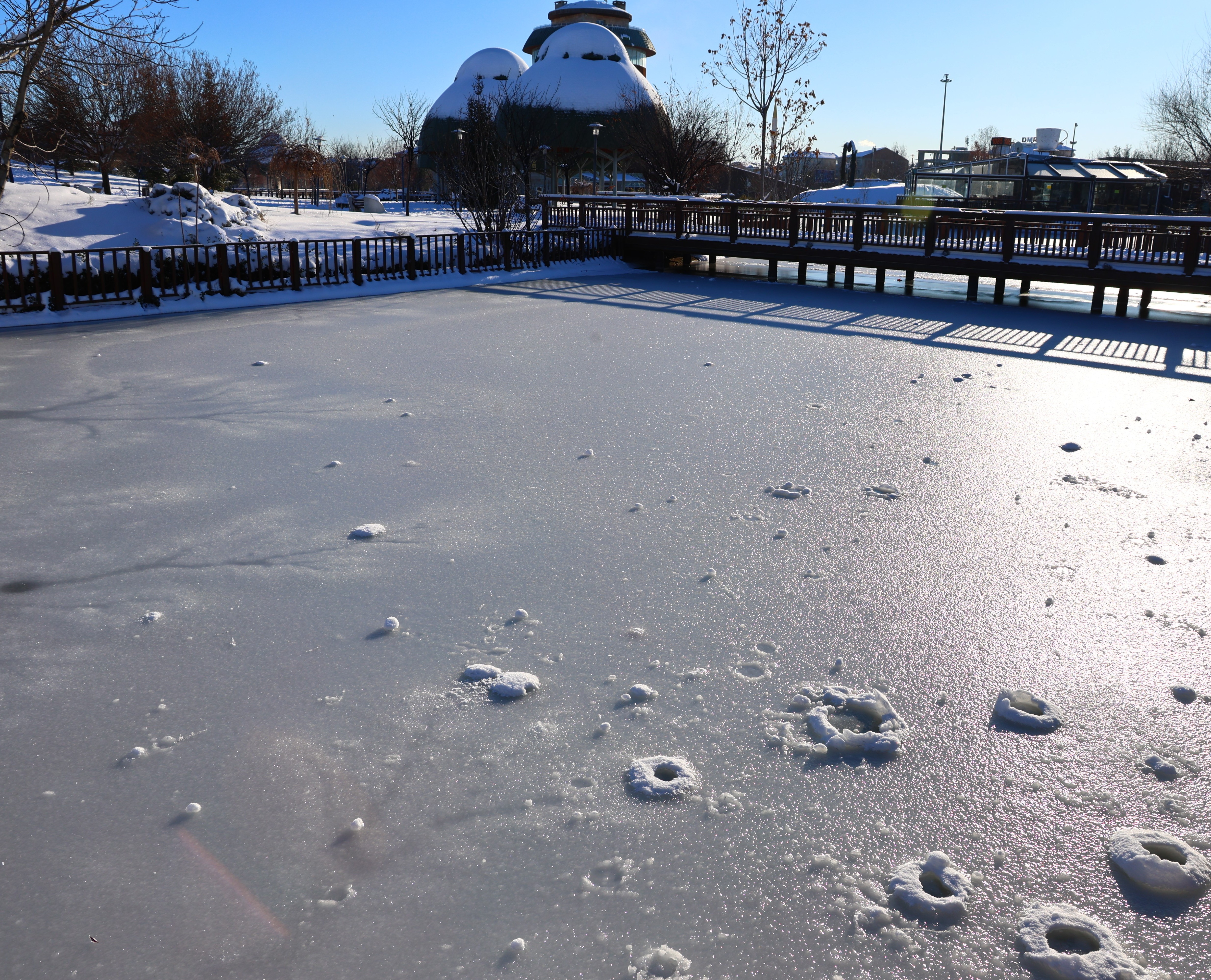 Park’ta bulunan kuğular ve ördekler ise havuzda oluşan buzların üstünde dolaştı