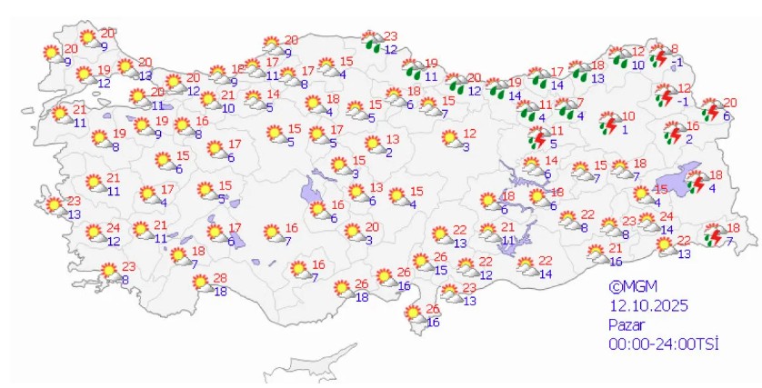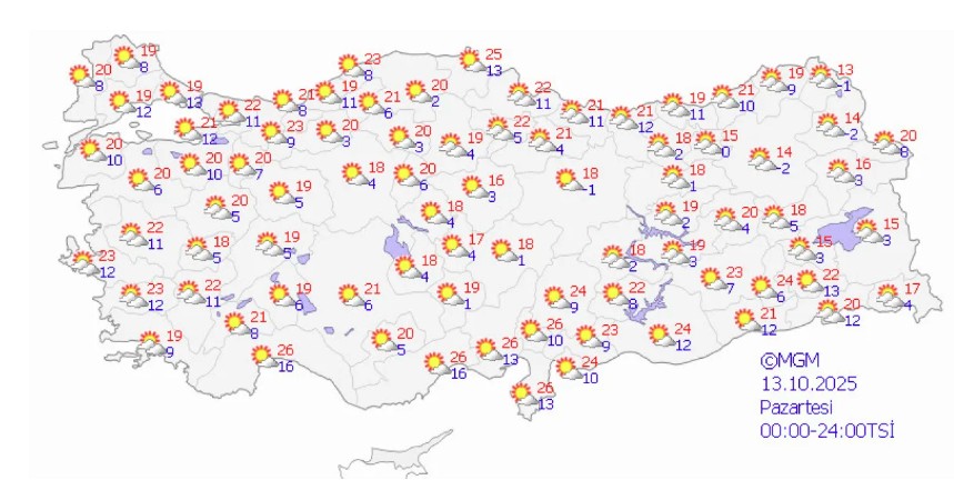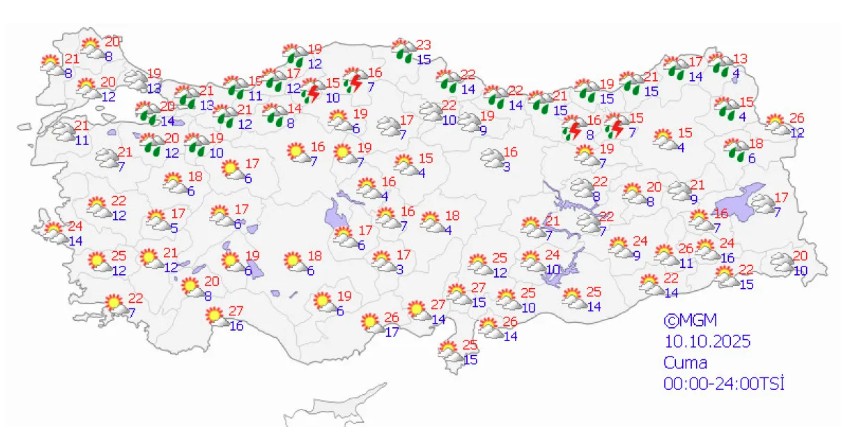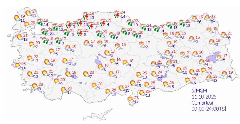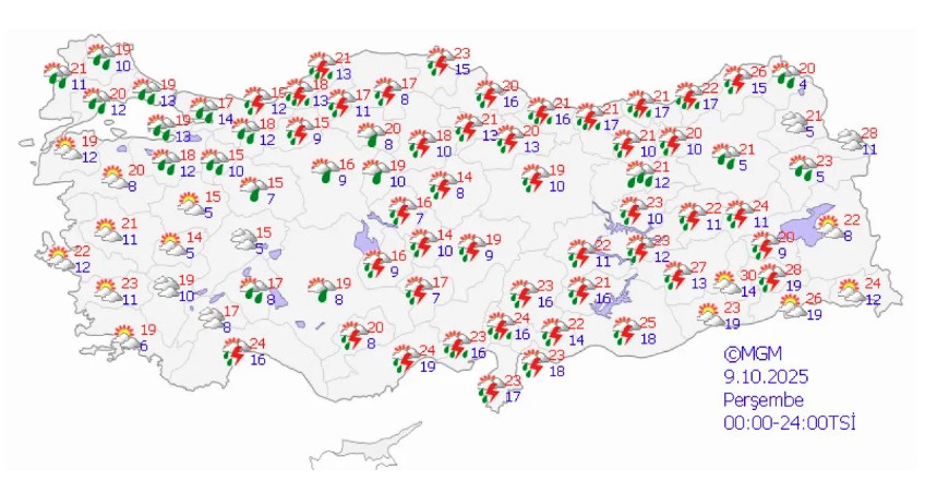 Meteoroloji Genel Müdürlüğü'nün (MGM) verilerine göre yurt genelinin parçalı ve çok bulutlu, Marmara'nın kuzey ve doğusu, Akdeniz, İç Anadolu, Karadeniz, Doğu Anadolu'nun kuzey ve batısı, Güneydoğu Anadolu'nun batısı ile Çanakkale, Kütahya, Bitlis ve Van çevrelerinin sağanak ve yer yer gök gürültülü sağanak yağışlı geçeceği tahmin ediliyor.