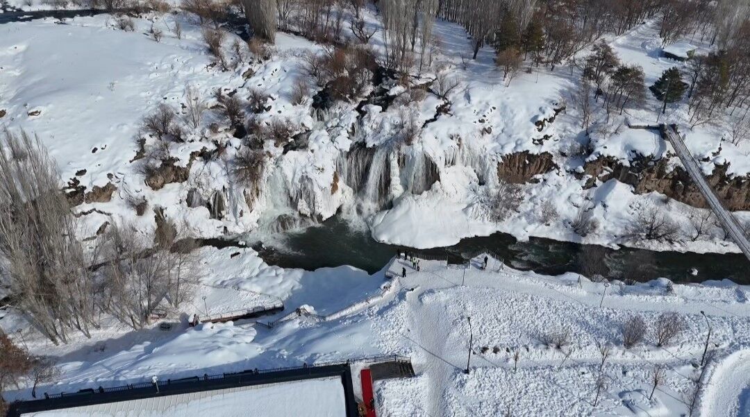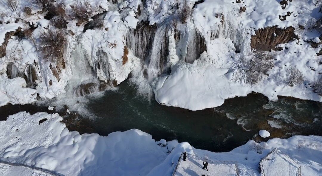 Hava sıcaklığının sıfırın altına düşmesiyle birlikte şelale buz tutarken, çevresini saran kar örtüsüyle ortaya çıkan manzara 'beyaz gelinlik' yakıştırmasını bir kez daha haklı çıkardı.