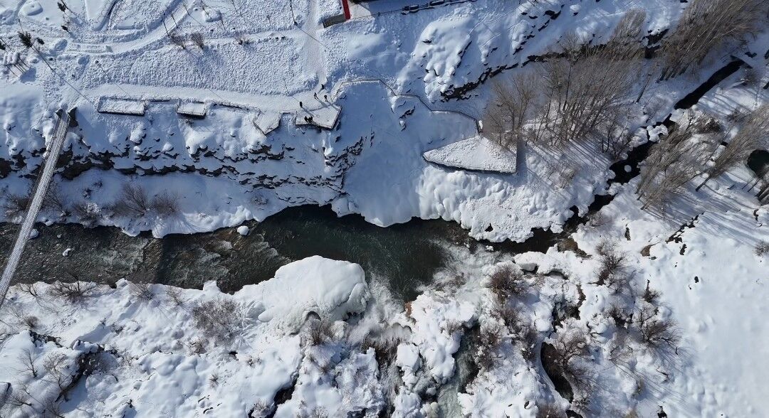 Bölgede etkili olan kar yağışı ve dondurucu soğuklar, yaklaşık 20 metre yükseklikten akan suları kısmen dondurarak dev buz sarkıtları oluşturdu.