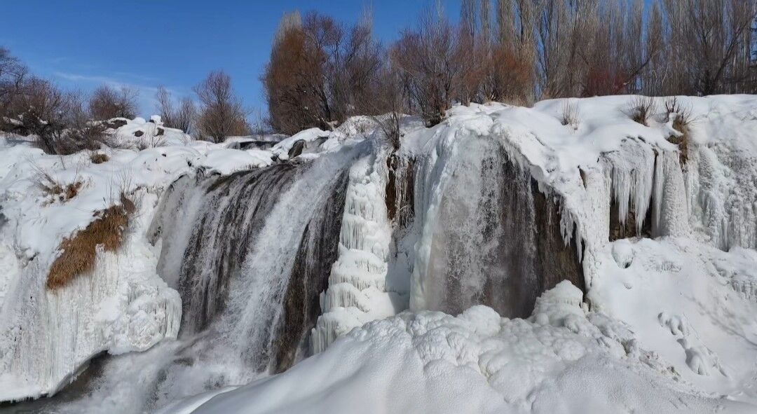 Van’ın doğa harikası Muradiye Şelalesi, dondurucu soğukların ardından adeta bir masal diyarına dönüştü.