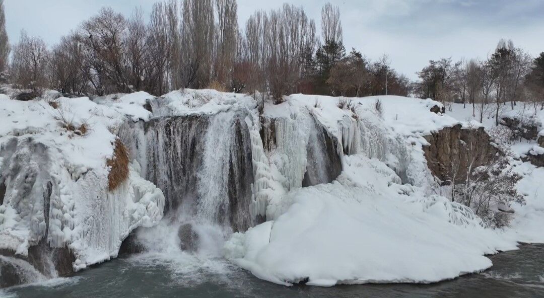 Kristalize olan su zerreleri ve çevredeki ağaçların üzerini kaplayan beyaz örtü, şelaleyi adeta bir doğa sanatına dönüştürdü.