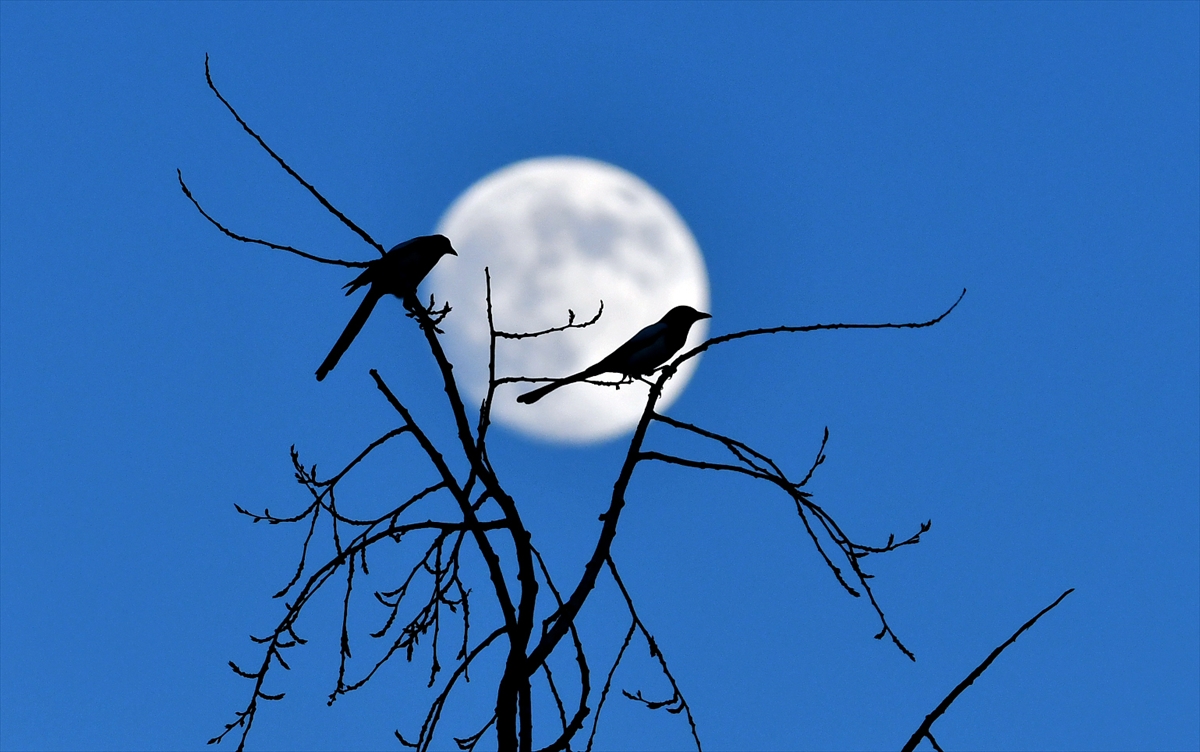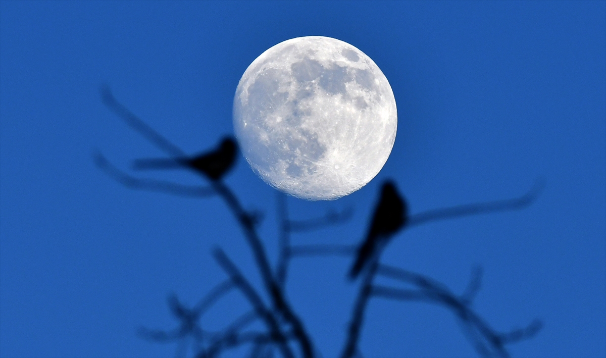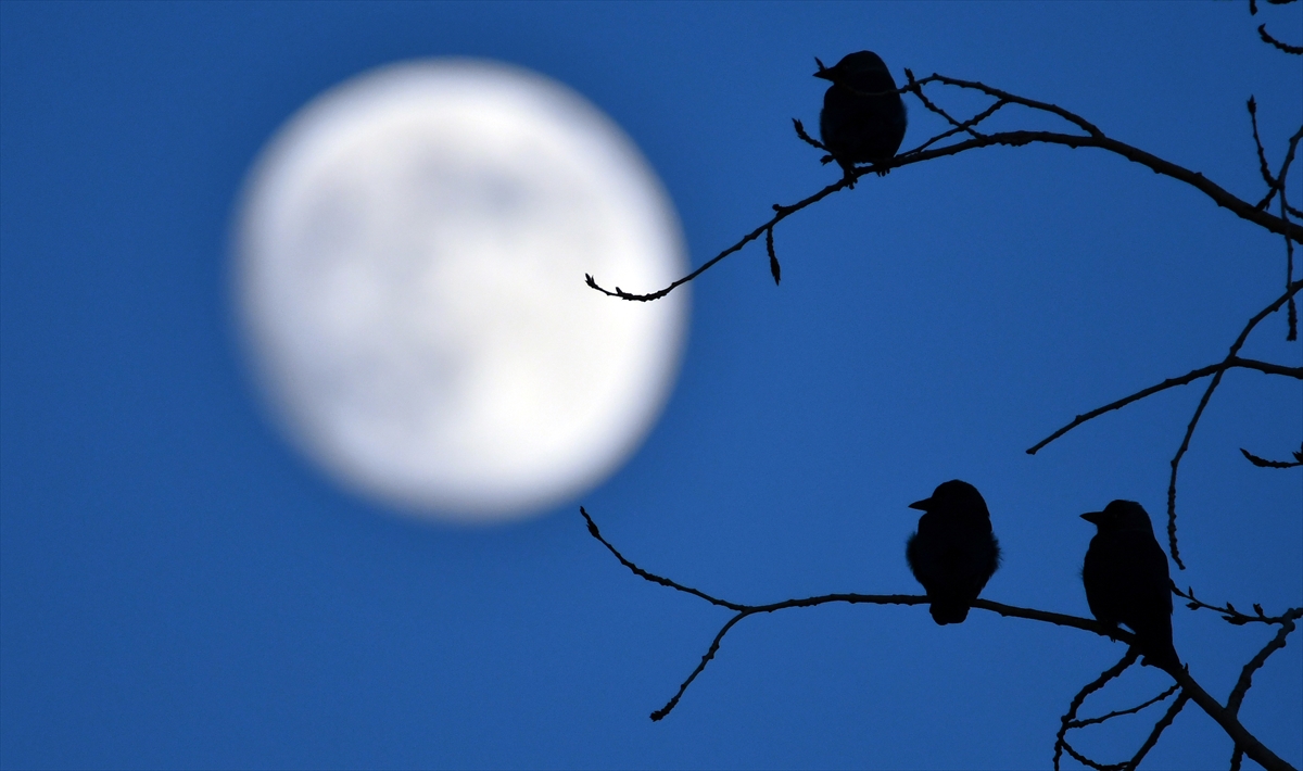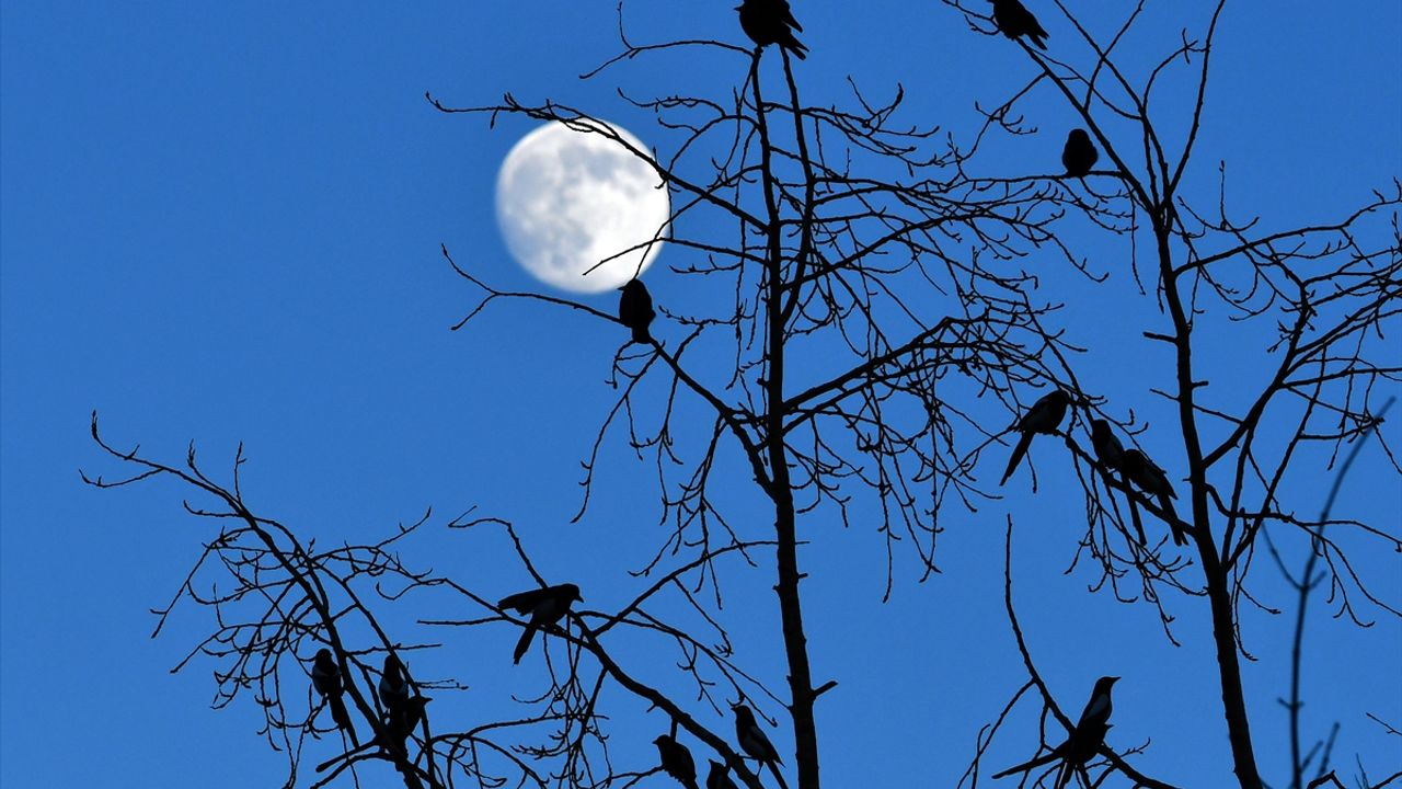 Akşam saatlerinde beliren dolunay, ağaç dallarını mesken tutan kuş sürüleriyle bütünleşti. Kuru dalların arasından süzülen ay ışığı ve kuşların hareketliliği, ilçede seyrine doyumsuz bir manzara oluşturdu.