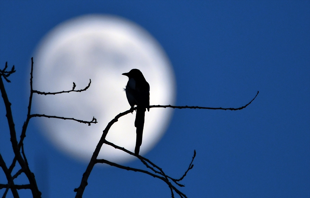 Sarıkamış semalarında parlayan dolunay, tek başına bir dala tüneyen kuşla kusursuz bir uyum yakaladı. Gökyüzündeki bu parlak fon, kuşun silüetini keskin bir çizgiyle ortaya çıkararak fotoğraf karelerine estetik bir derinlik kattı.