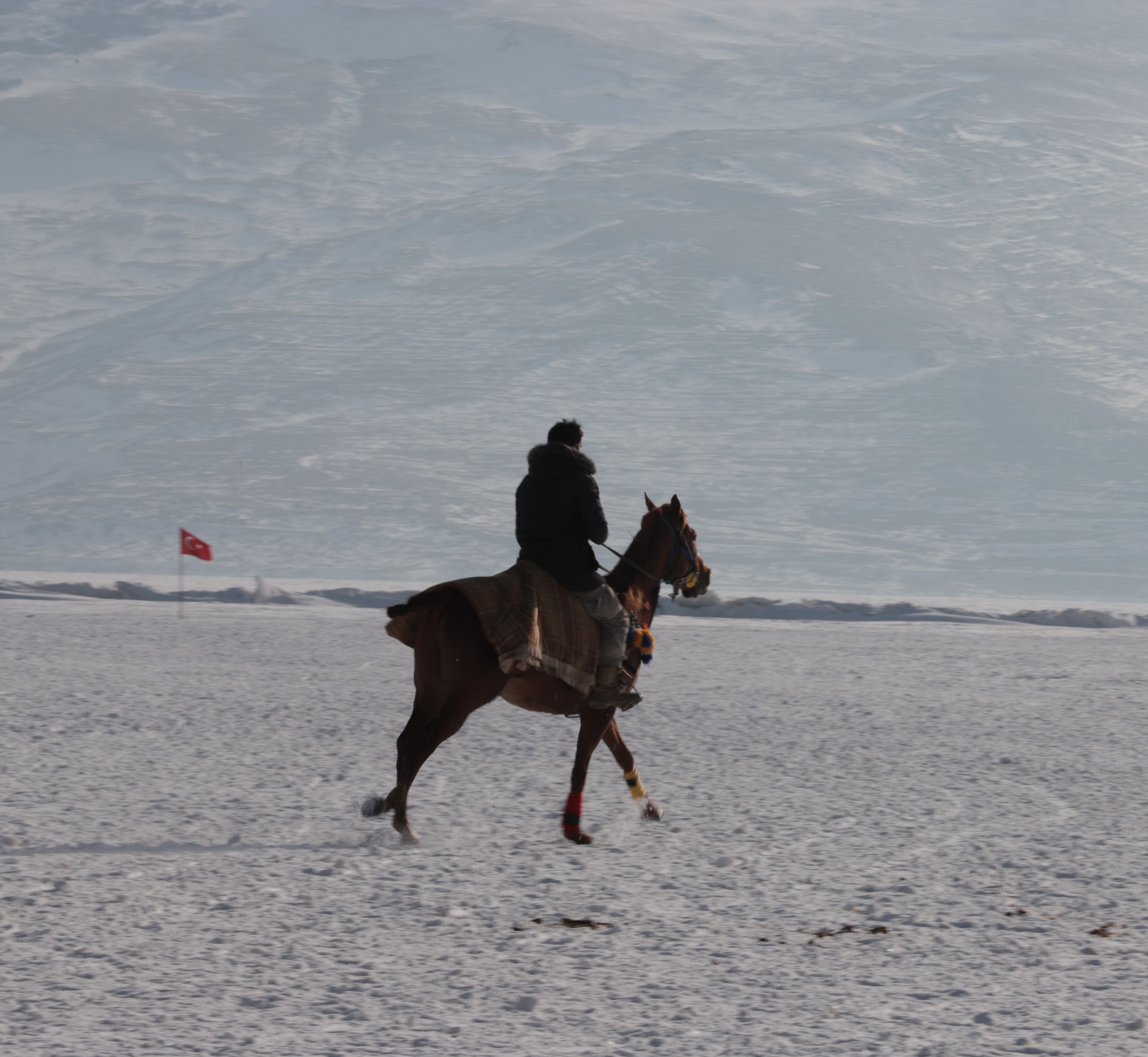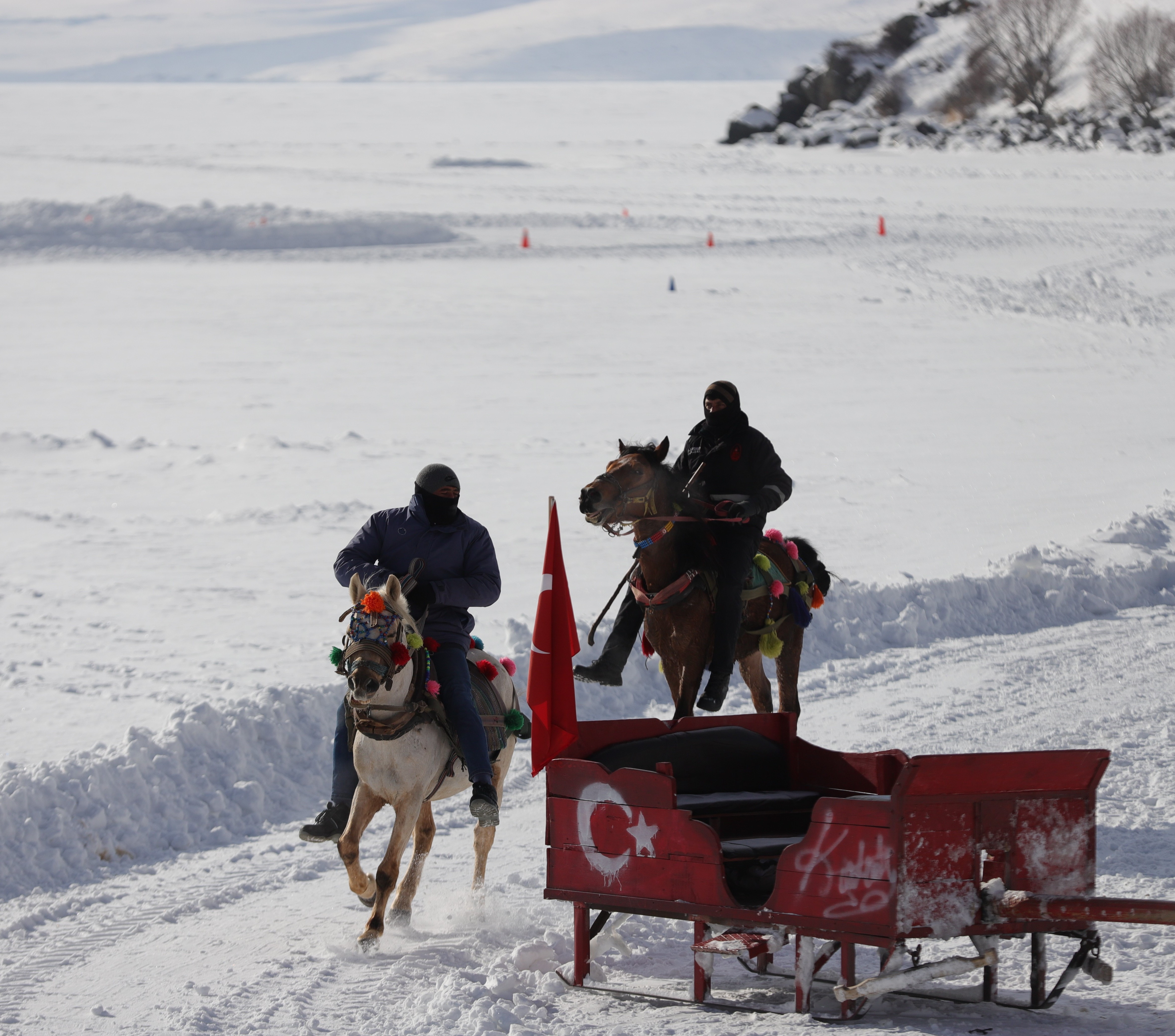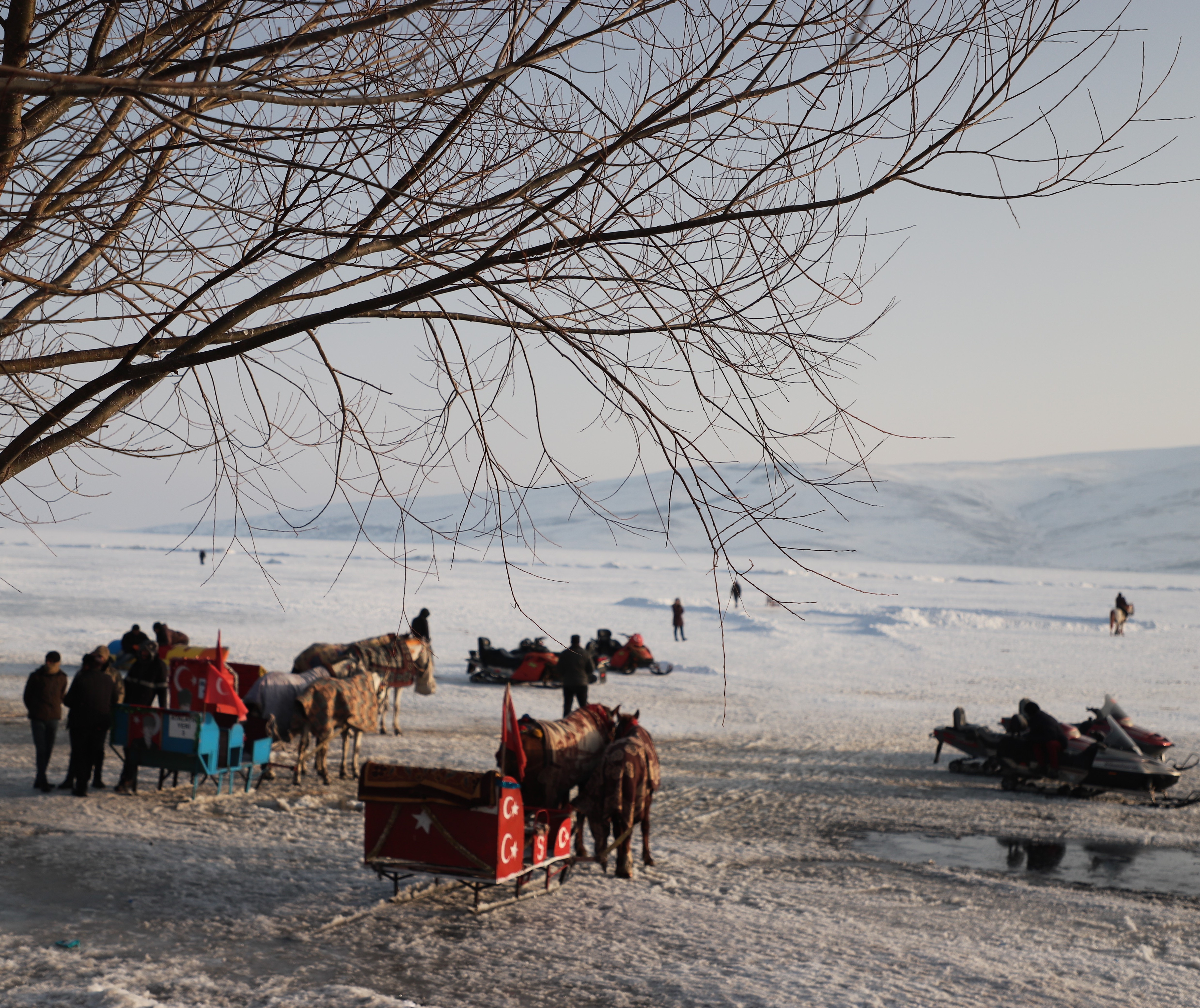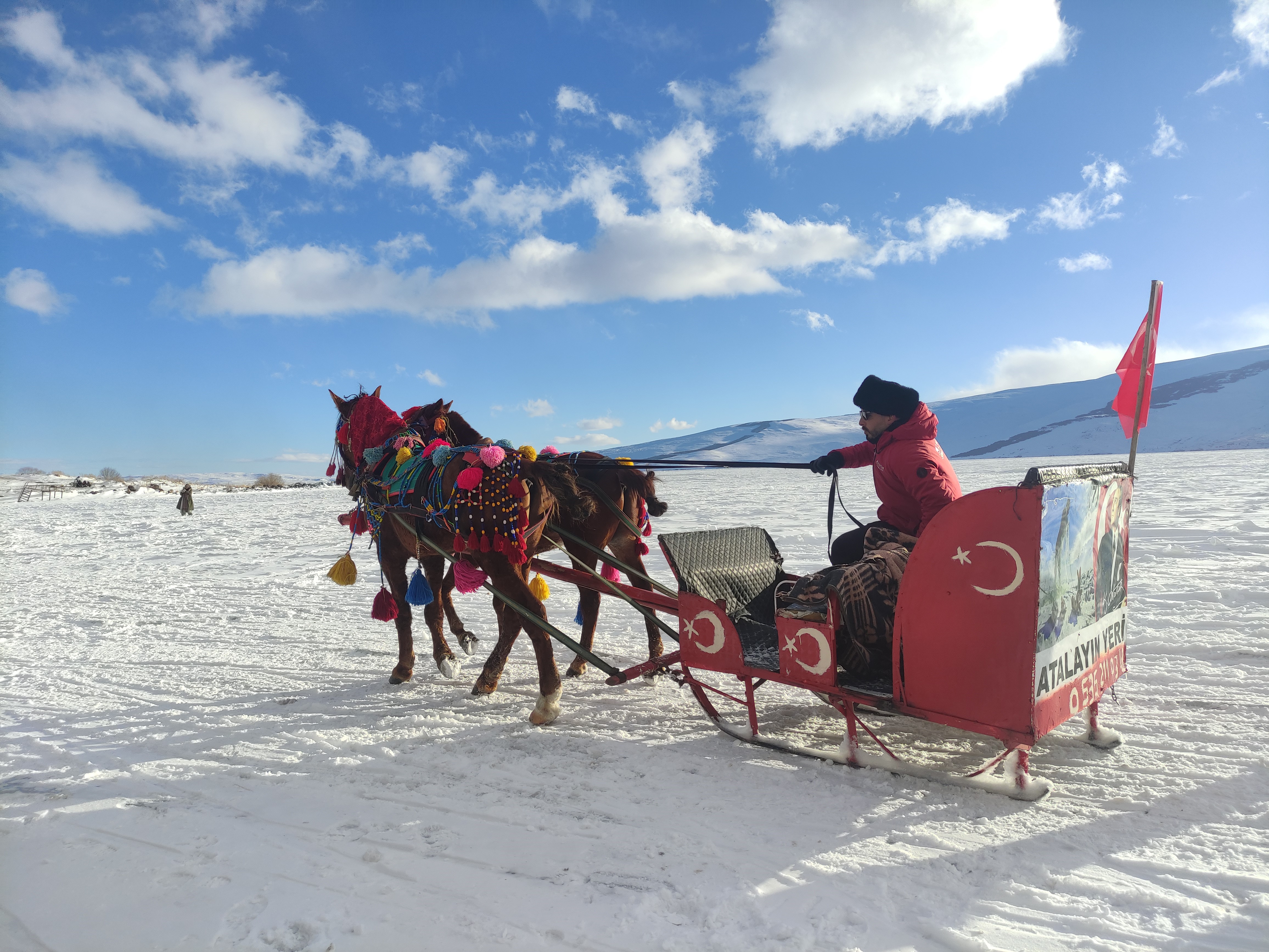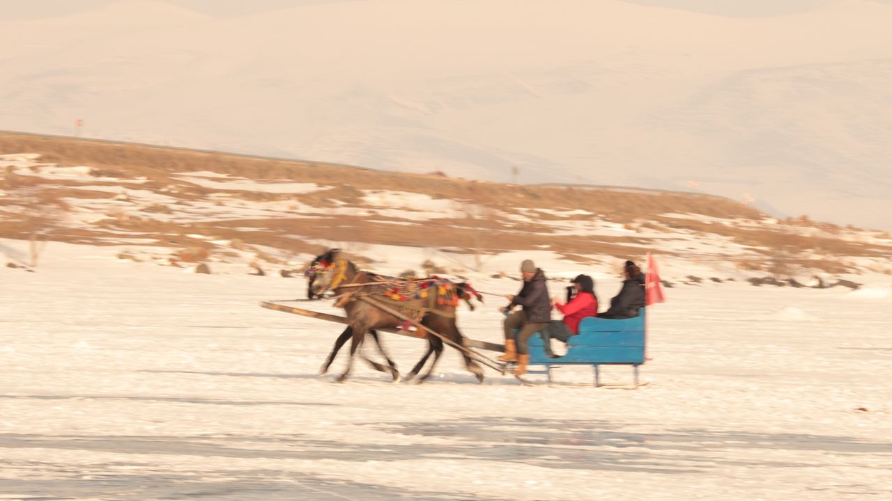 Çıldır Gölü'nün buz tutan yüzeyinde bir süre gezen, fotoğraf çekilen vatandaşlar daha sonra sevdikleriyle birlikte atlı kızaklara binerek yüzeyi buz tutan gölde atlı kızak ile gezinti yapıyor.