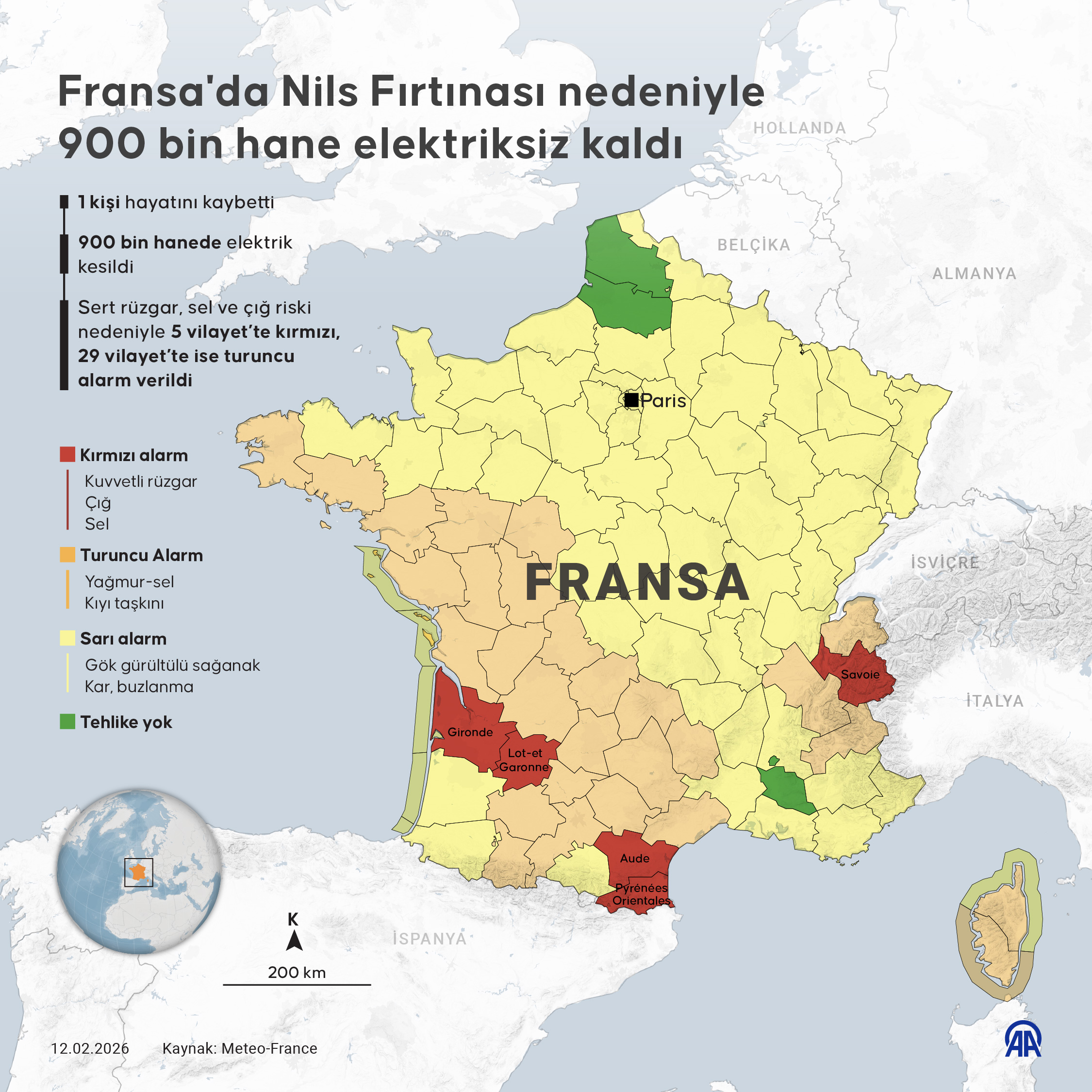 Fransa'nın elektrik altyapısından sorumlu kuruluşu Enedis, fırtınanın şebekeye verdiği ağır hasar nedeniyle 900 bin haneye elektrik verilemediğini duyurdu. Ülkenin güneybatısında yoğunlaşan kesintilerin giderilmesi için ekipler teyakkuza geçerken, olumsuz hava koşulları onarım çalışmalarını güçleştiriyor.