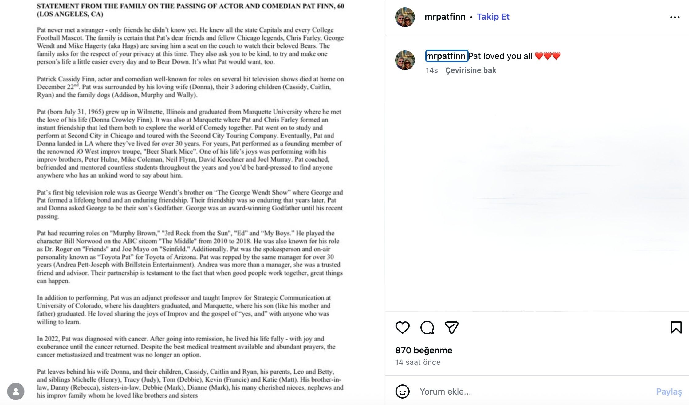 Pat Finn’in “hiçbir zaman yabancı tanımadığı, henüz tanışmadığı dostları olduğu” vurgulanırken; neşesi, insanlarla kurduğu güçlü bağ ve mizah tutkusuyla çevresinde derin izler bıraktığı ifade edildi. Açıklamada ayrıca, bu zor süreçte mahremiyetlerine saygı gösterilmesi ve insanların birbirine karşı daha nazik olması çağrısında bulunuldu.
