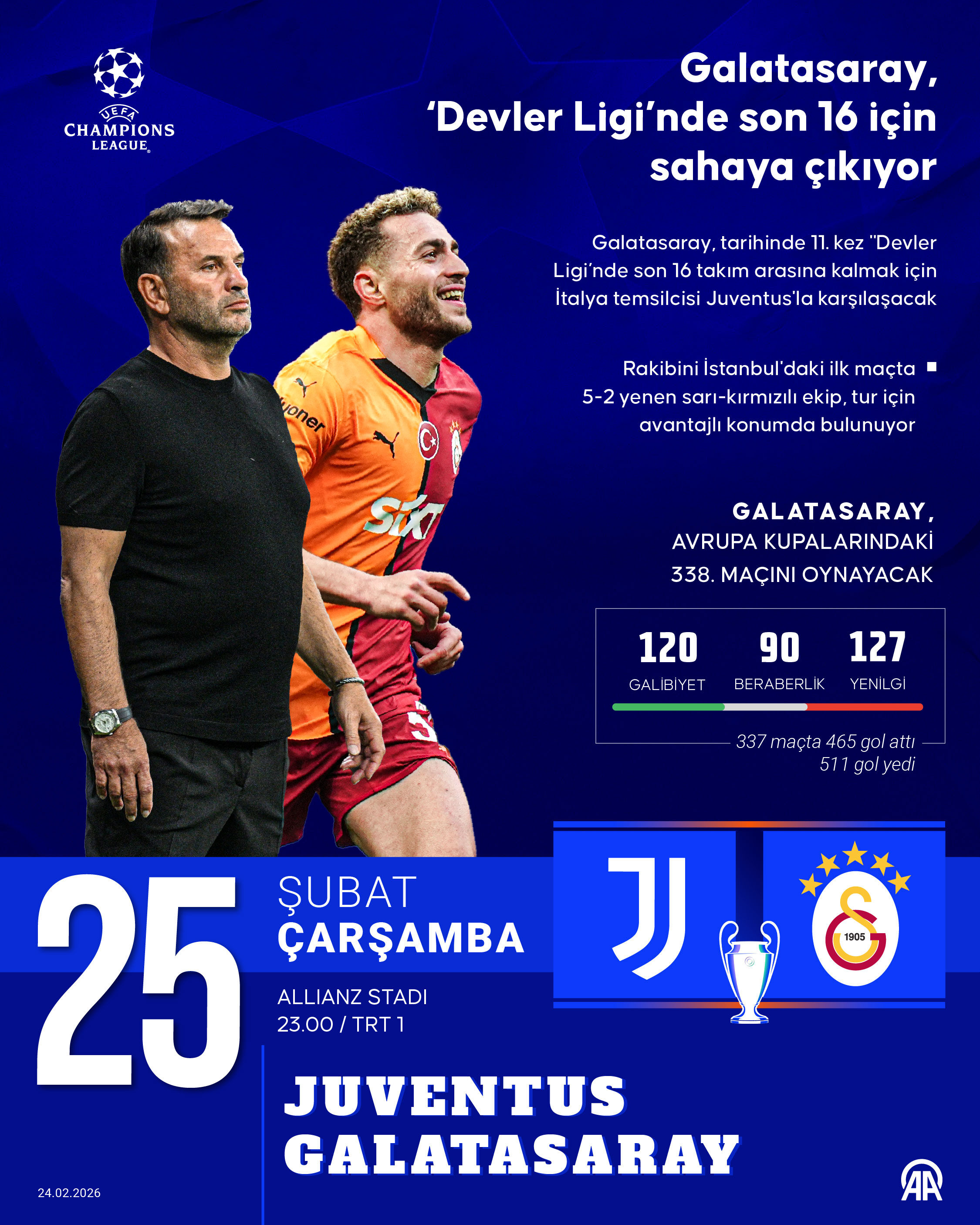 UEFA Şampiyonlar Ligi son 16 Play Off turu maçında bu gece İtalyan ekibi Juventus’a konuk olacak Galatasaray, Avrupa kupalarındaki 338. karşılaşmasına çıkacak.