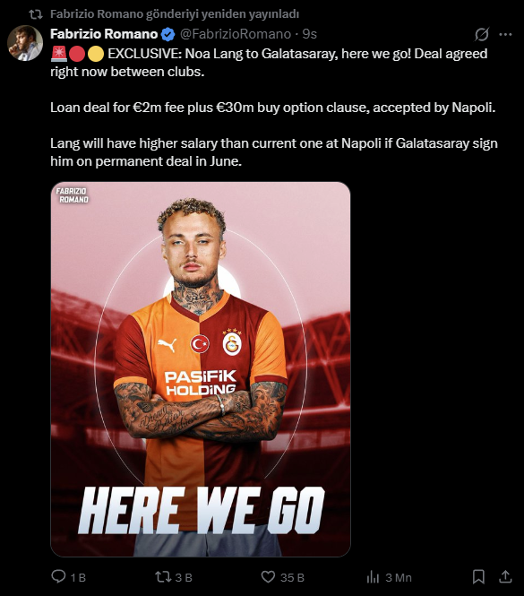 Ünlü gazeteci Fabrizio Romano’nun haberine göre: Galatasaray, Noa Lang transferi için Napoli ile anlaşmaya vardı. Haberde, transferin kiralama + satın alma opsiyonu formülüyle gerçekleşeceği belirtildi.