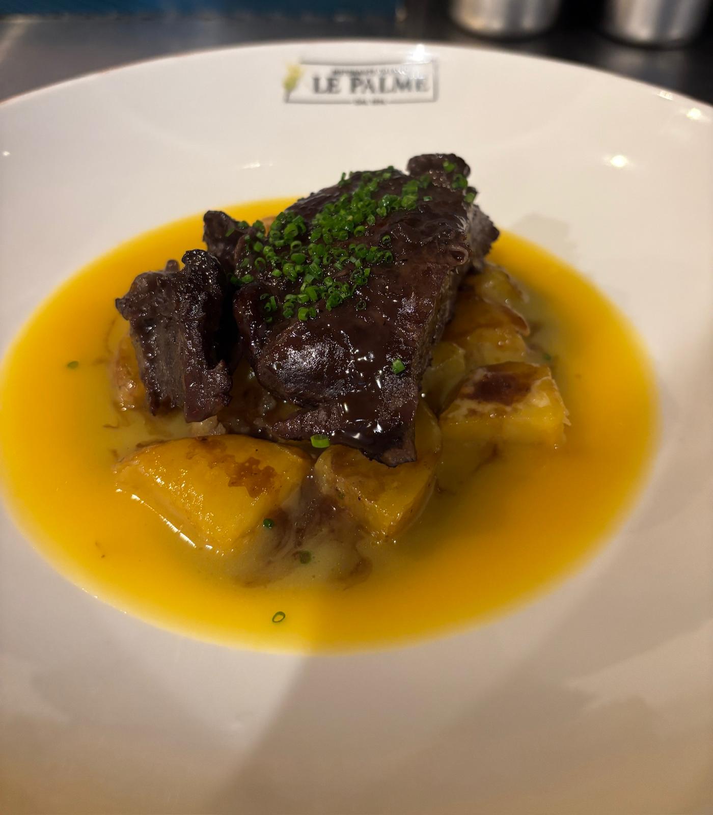 Kesinlikle dana yanak. 12 saatlik bir marinasyonun ardından, 6 saat boyunca şarapta pişiyor. Et eriyecek kadar yumuşak bir kıvam alıyor ama içi ve dışı tamamen sulu, canlı ve parça bir et gibi kalıyor. Altında üç işlemden geçen yarım ay patatesler var: haşlama, fırınlama ve son olarak tavada montaj. Sadece tereyağı, parmesan, tuz ve karabiber. Üzerine dana yanağın kendi şarabıyla çektirilmiş suyu ekleniyor ve tabağın tazeliği frenk soğanıyla tamamlanıyor. Bazı misafirlerin “Sadece alttaki patates için geldik,” demesi, bu tabağın doğru yerde durduğunu hissettiriyor ve beni çok mutlu ediyor.