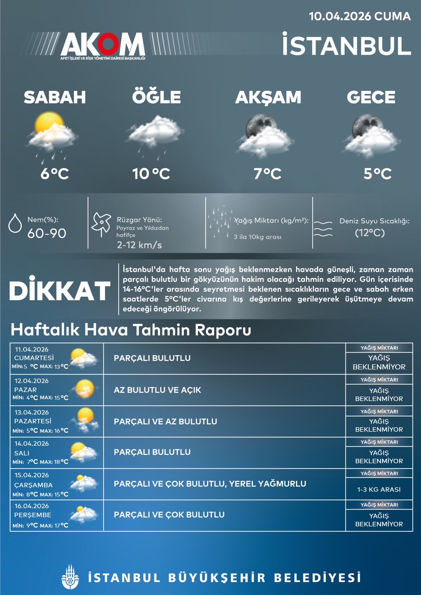 İstanbul Büyükşehir Belediyesi Afet İşleri ve Risk Yönetimi Dairesi Başkanlığı (AKOM), 10 Nisan Cuma günü itibarıyla şehirdeki son hava durumu verilerini paylaştı. Günün ilk saatlerinde 6 dereceye kadar düşen sıcaklıkların, gece saatlerinde 5 dereceye kadar gerilemesi bekleniyor.