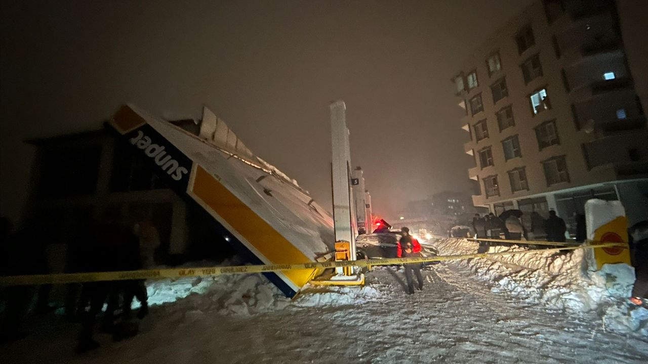 İlçenin Merkez Mahallesi'ndeki bir akaryakıt istasyonunda pompaların bulunduğu bölümün çatısı, yoğun kar nedeniyle çöktü.