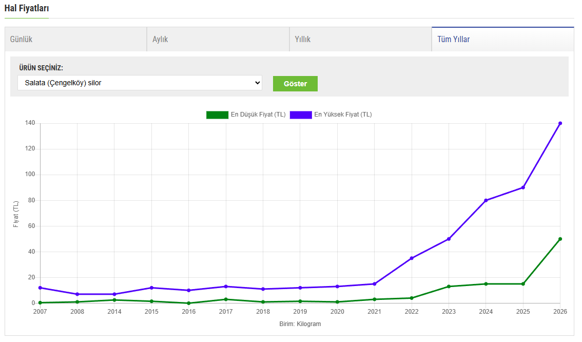 Uzun dönemli hal fiyatları incelendiğinde, salatalıkta asıl kırılmanın 2021 sonrasında yaşandığı görülüyor. 2007–2020 arasında 10–15 TL bandında seyreden en yüksek hal fiyatları, son yıllarda hızla yükselerek 2023’te 50 TL, 2024’te 80 TL, 2025’te 90 TL seviyelerine ulaştı. 2026 başında ise bu rakam 130 TL ile yeni bir zirveye çıktı.